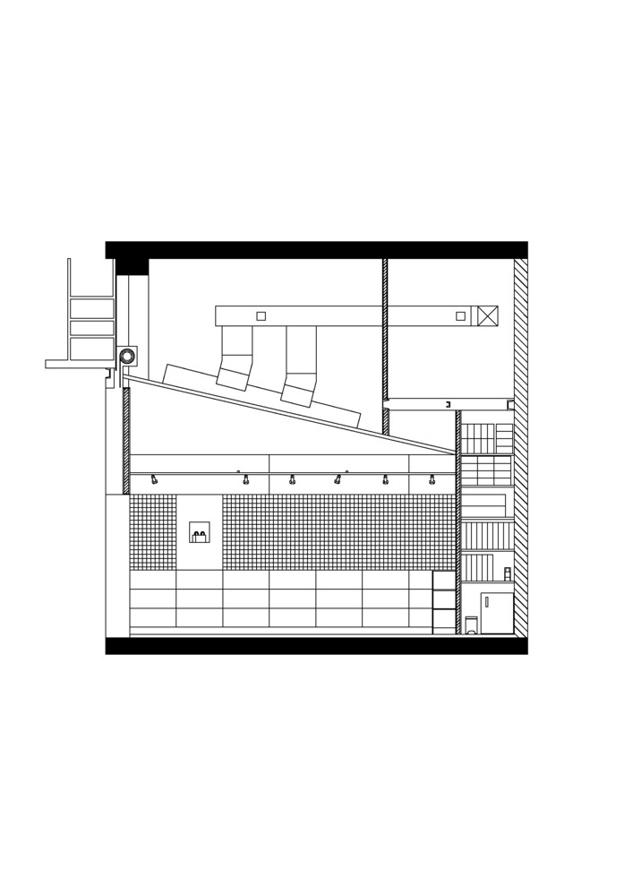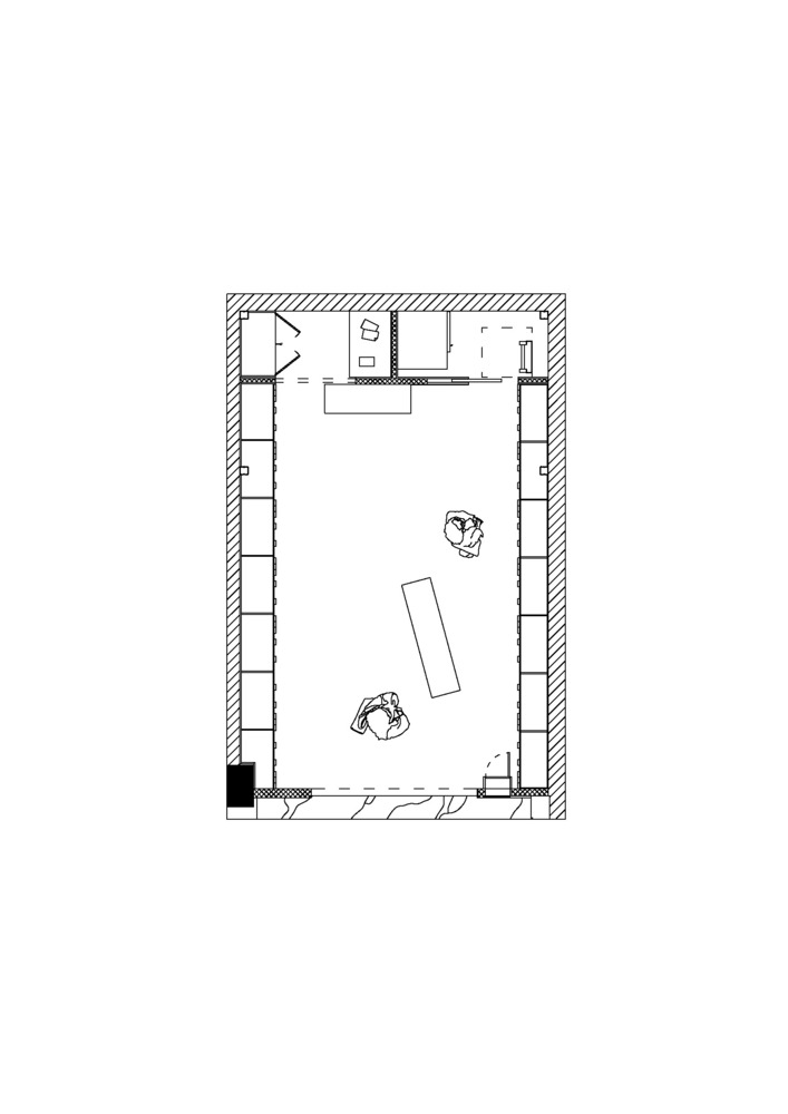 与内部墙面深色且具有吸收性的表面(旨在处理环境的声学问题并突出珠宝)不同,灰色自流平环氧树脂地面和涂成白色的倾斜石膏天花板起到了反射和折射光线的作用。环境照明通过对侧面板的间接光源和指向珠宝的射灯实现,射灯分布在两个悬挂的轨道上。
