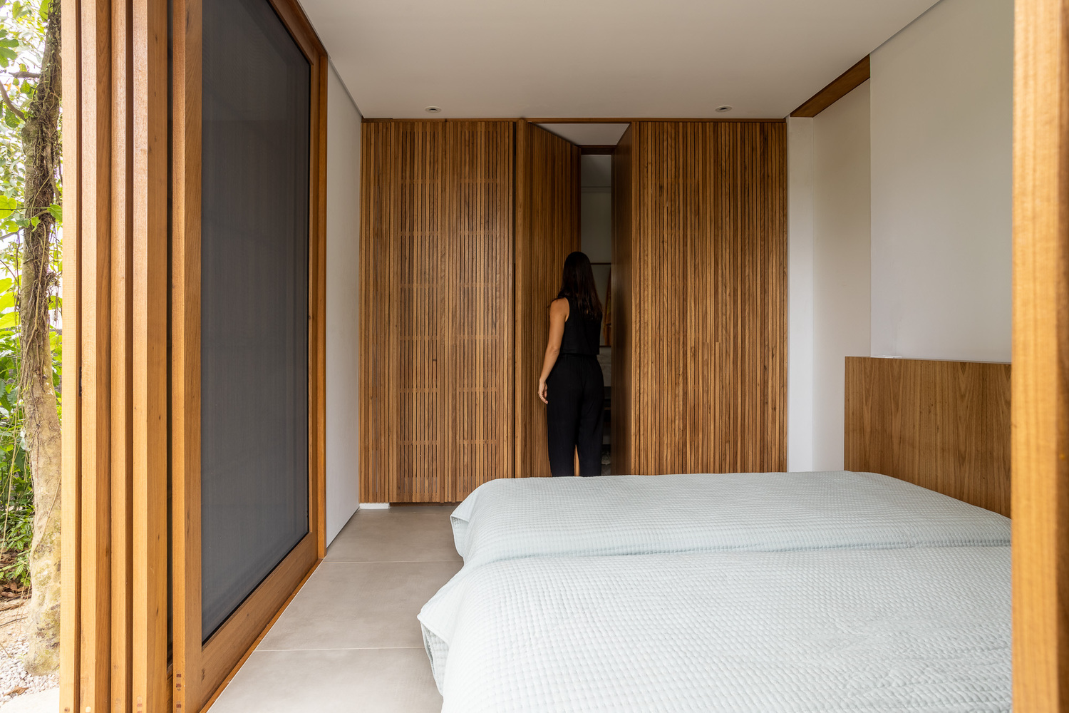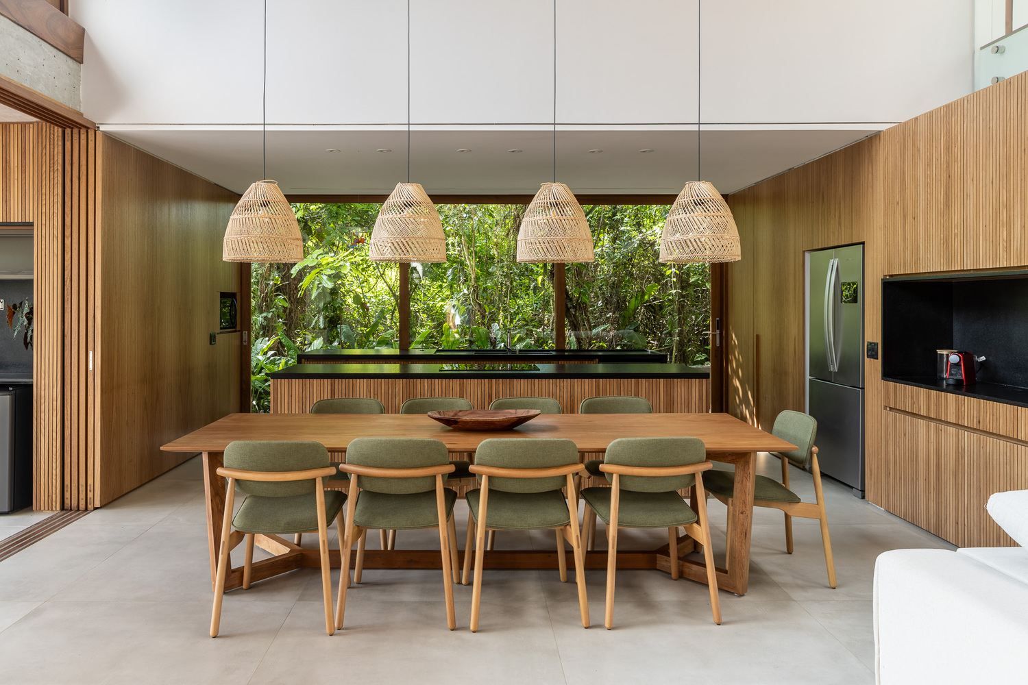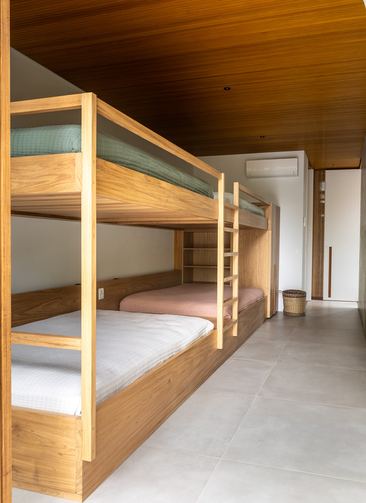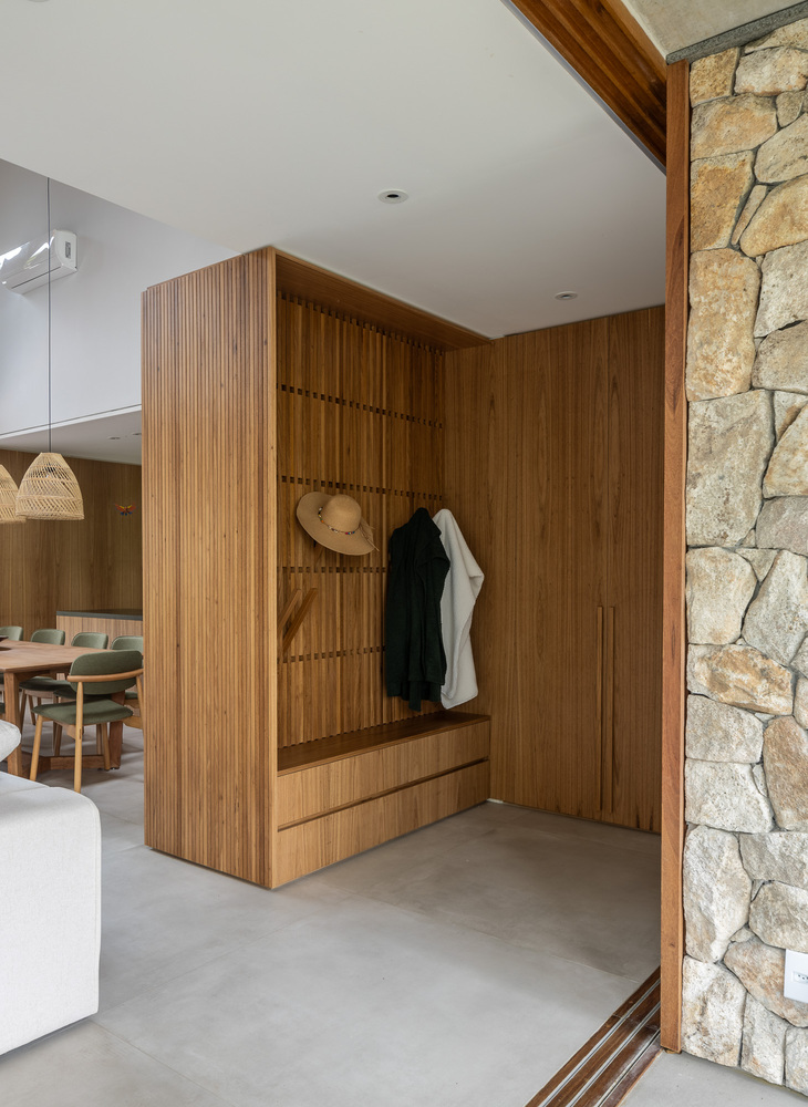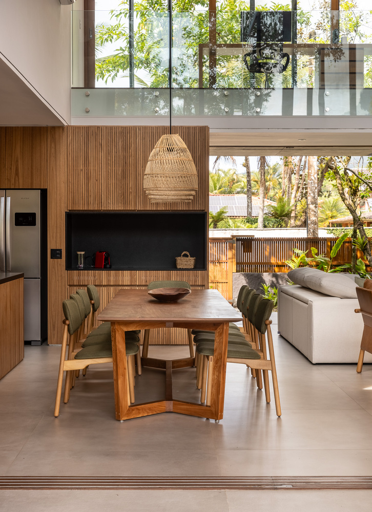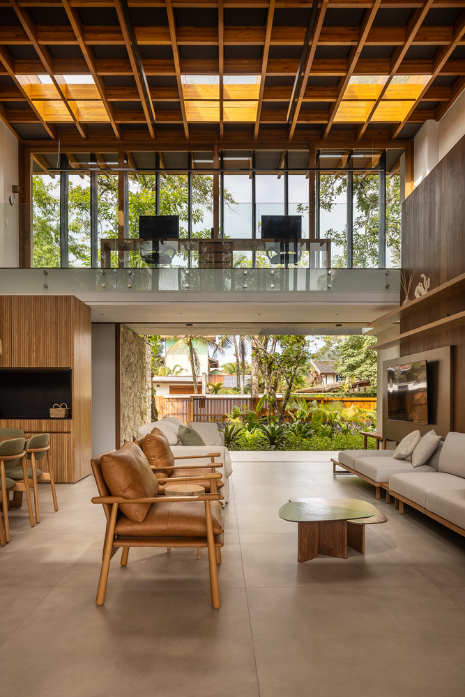 该住宅的设计旨在完全向室外敞开。罗德里戈・阿尔维斯・佩雷拉表示:“通过使用大型滑动面板、可移动的遮阳板和宽阔的屋檐,我们力求在确保室内外空间融合的同时,为家庭成员的舒适提供必要的保护。” 挑高的双层天花板营造出宽敞的空间感,这是设计的关键元素之一,使居民在客厅的任何位置都能欣赏到天空的景色。此外,还安装了天窗,以最大限度地引入自然光线。路易莎・奎里多说:“每一个细节都经过精心考量,目的是打造一个与自然融合的避风港,同时不失精致感。木材以及屋顶上使用的 MLC 等天然材料,对于营造这种温暖的感觉以及与户外的连接至关重要。”