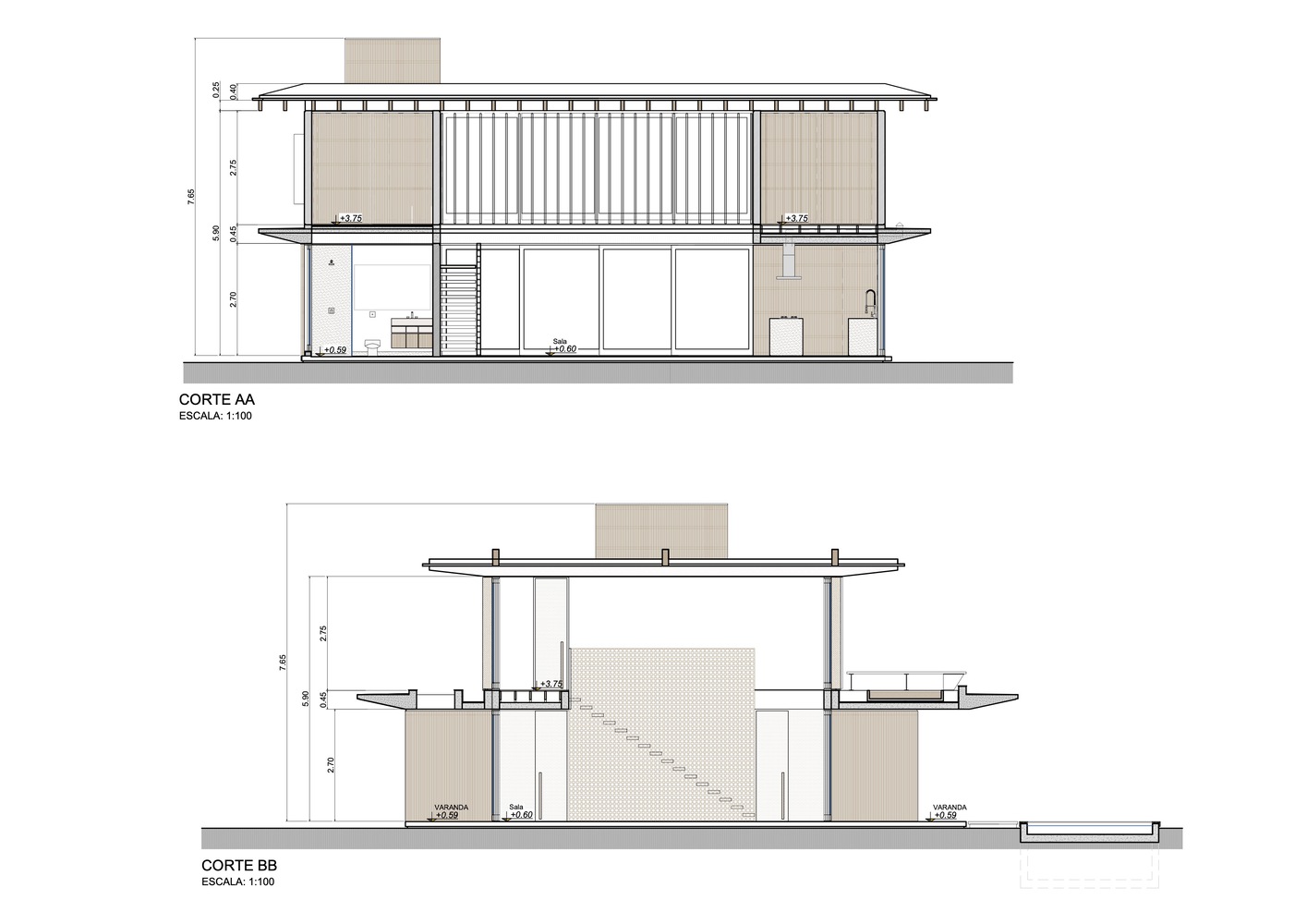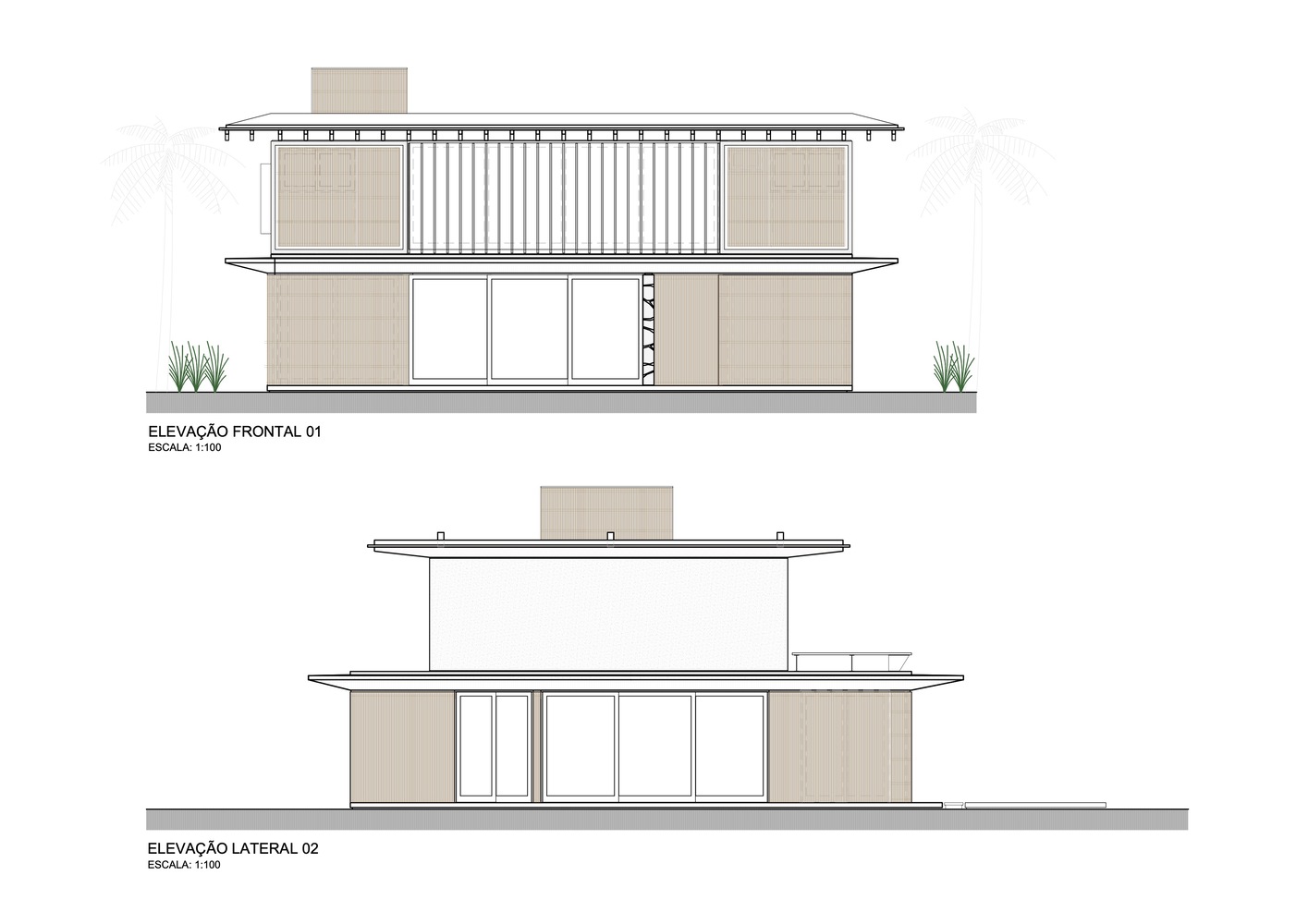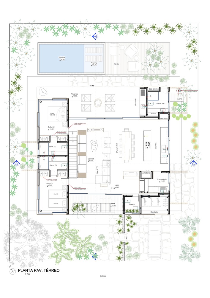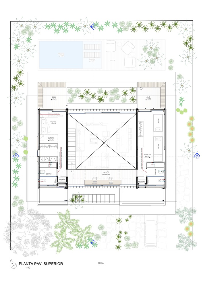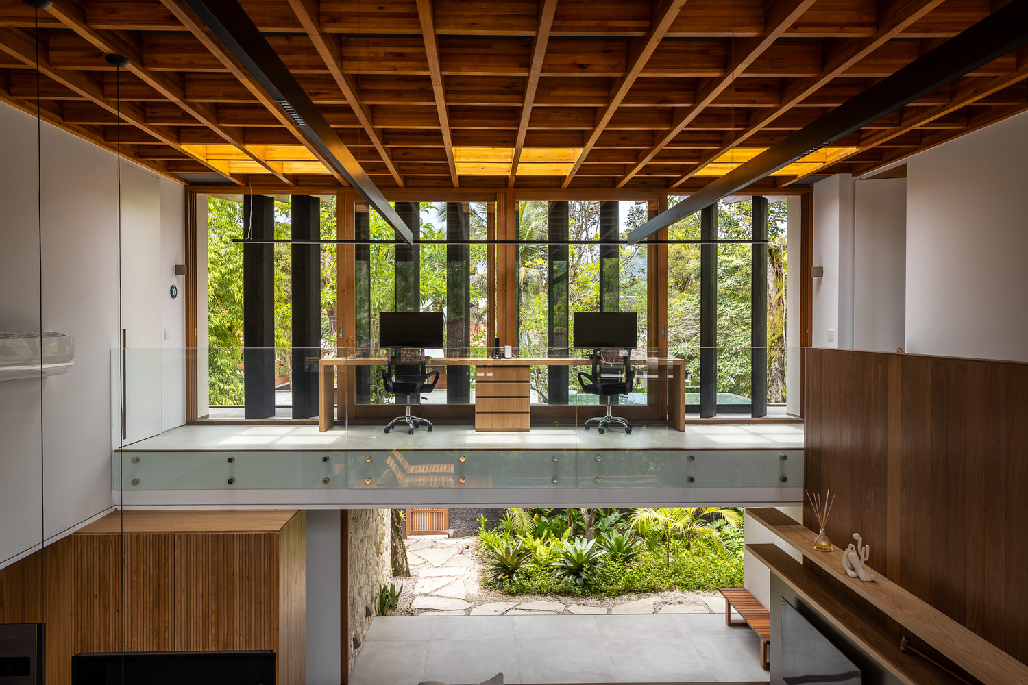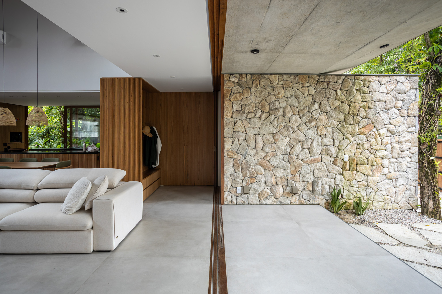 该住宅的设计旨在完全向室外敞开。罗德里戈・阿尔维斯・佩雷拉表示:“通过使用大型滑动面板、可移动的遮阳板和宽阔的屋檐,我们力求在确保室内外空间融合的同时,为家庭成员的舒适提供必要的保护。” 挑高的双层天花板营造出宽敞的空间感,这是设计的关键元素之一,使居民在客厅的任何位置都能欣赏到天空的景色。此外,还安装了天窗,以最大限度地引入自然光线。路易莎・奎里多说:“每一个细节都经过精心考量,目的是打造一个与自然融合的避风港,同时不失精致感。木材以及屋顶上使用的 MLC 等天然材料,对于营造这种温暖的感觉以及与户外的连接至关重要。”
