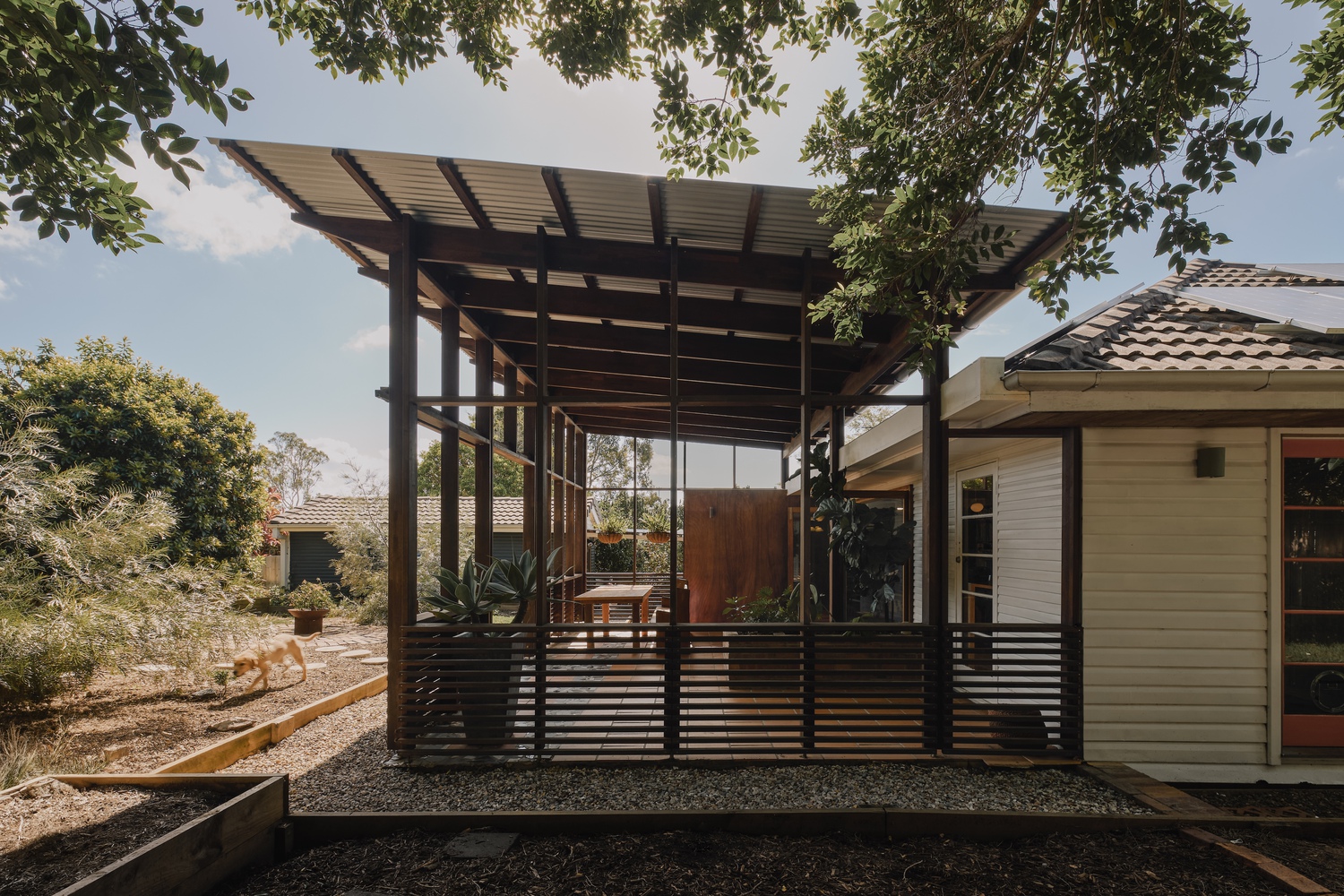 我们的愿景围绕着保留战后原有结构(其基础稳固)来减少环境影响。尽可能重复使用和保留现有材料,例如 pavilion 的赤陶地板就取自原房屋。其他例子包括从剩余项目中回收的部分瓷砖,以及从附近开发项目剩余库存中取用的西部红雪松 soffits。花园花坛由原凉棚的回收横梁制成。种植池由原房屋周围小径的回收砖块制成。鸡舍由回收的雪松和旧墙框架制成。凉棚由 Kwila 和 Spotted Gum 建造 —— 特意选择这些木材是因其可持续性资质。该项目包括在屋顶安装新的 6.6 千瓦太阳能系统(20 块电池板)。
