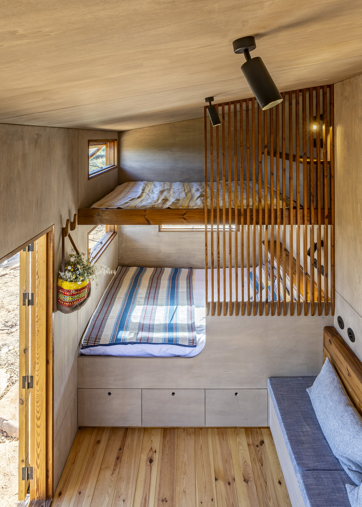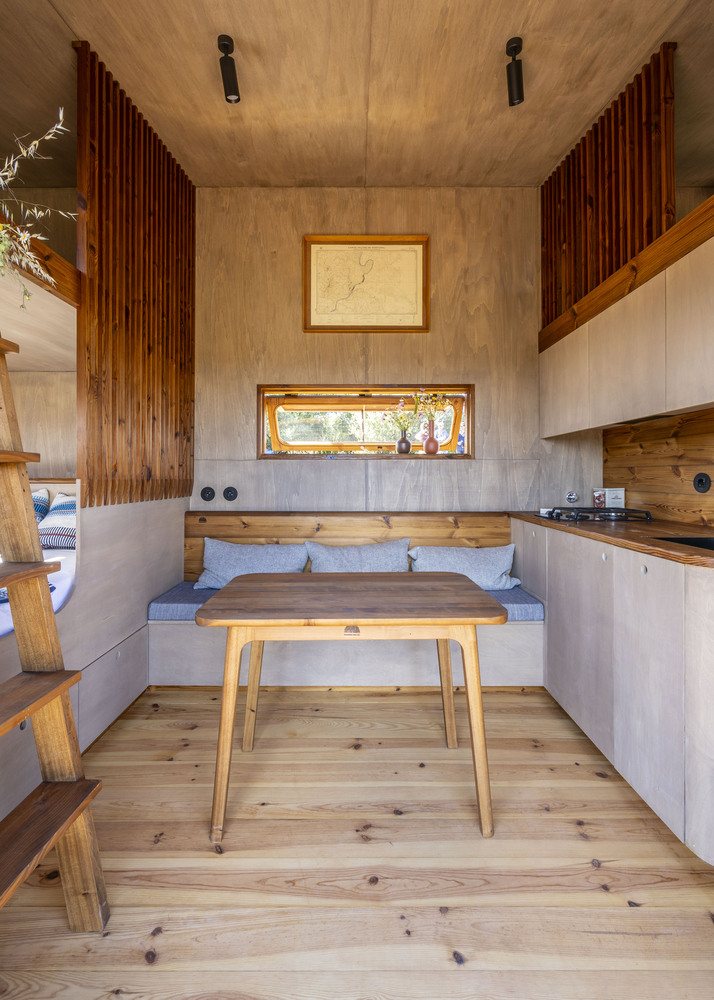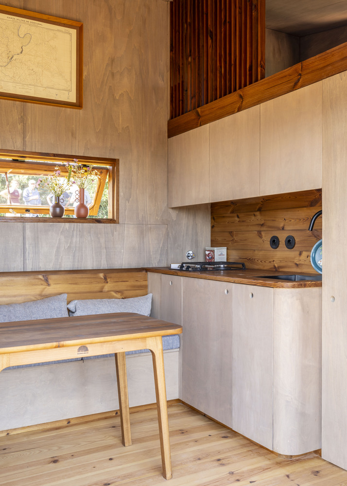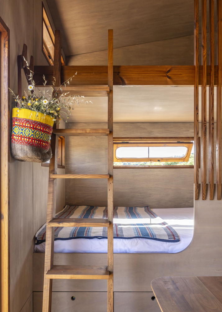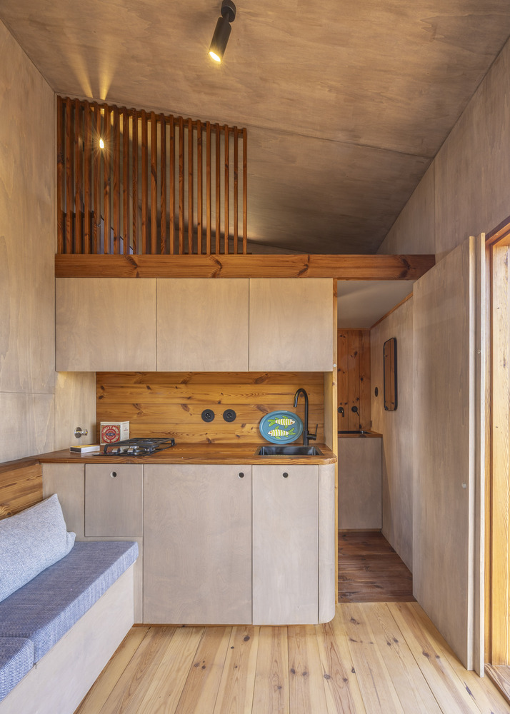 该项目是这家人与 Madeiguincho 工作室合作的成果,融合了手工艺、空间效率以及与当地的紧密联系。这座住宅仅为 2.5 米宽、5.5 米长,却能以令人惊喜的舒适程度容纳多达 6 人,这要归功于巧妙的空间布局:中央起居区、走廊式的实用厨房,以及三间双人床,分别分布在一层和上层的卧铺处。