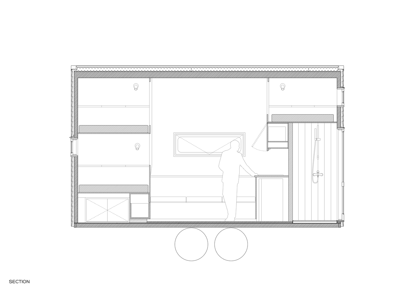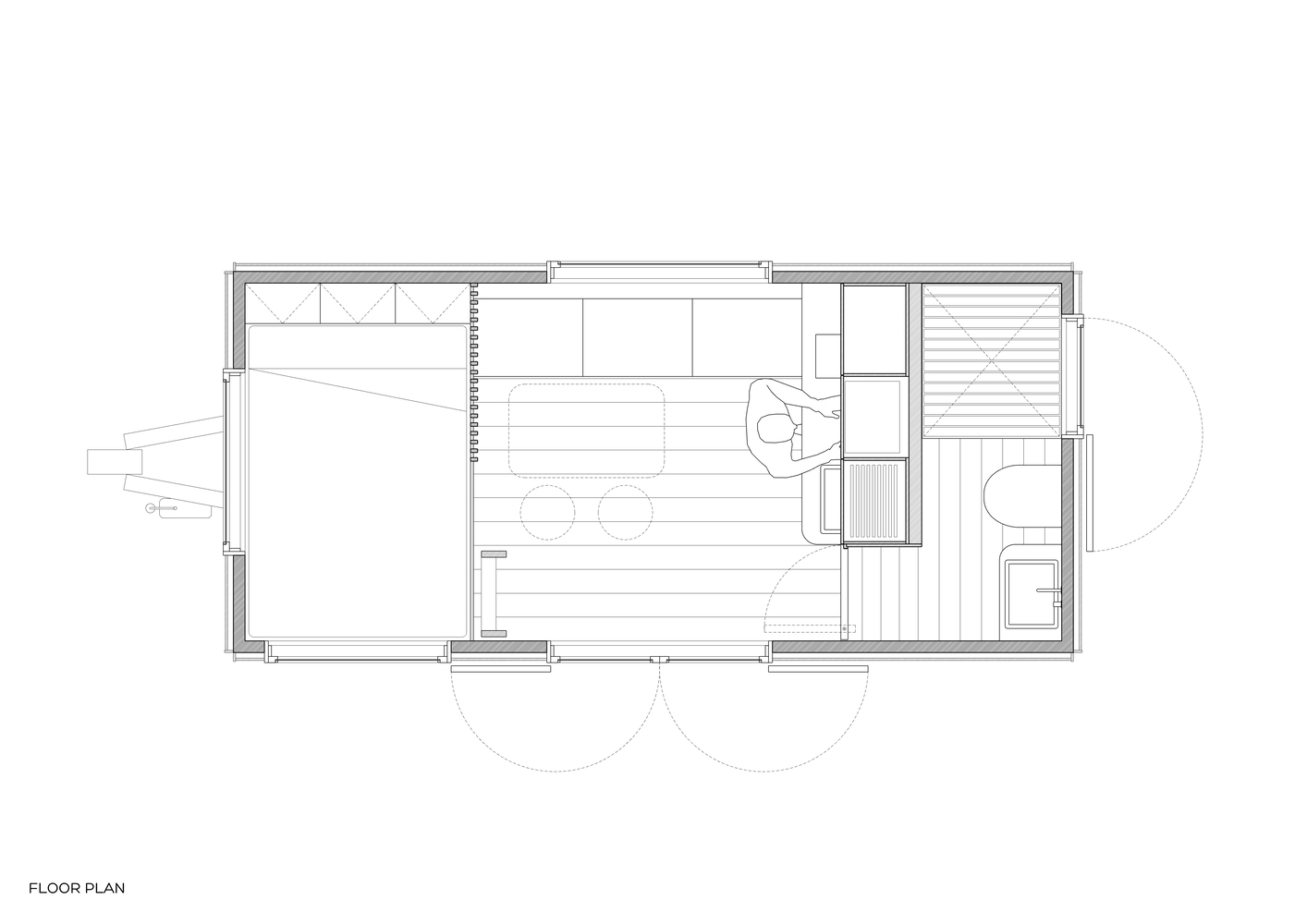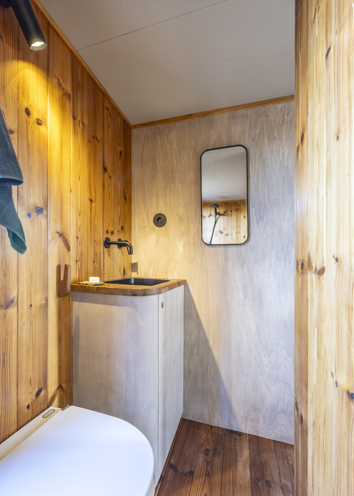 该项目是这家人与 Madeiguincho 工作室合作的成果,融合了手工艺、空间效率以及与当地的紧密联系。这座住宅仅为 2.5 米宽、5.5 米长,却能以令人惊喜的舒适程度容纳多达 6 人,这要归功于巧妙的空间布局:中央起居区、走廊式的实用厨房,以及三间双人床,分别分布在一层和上层的卧铺处。