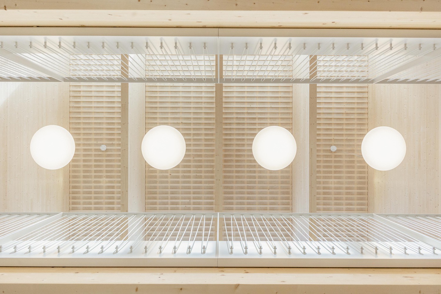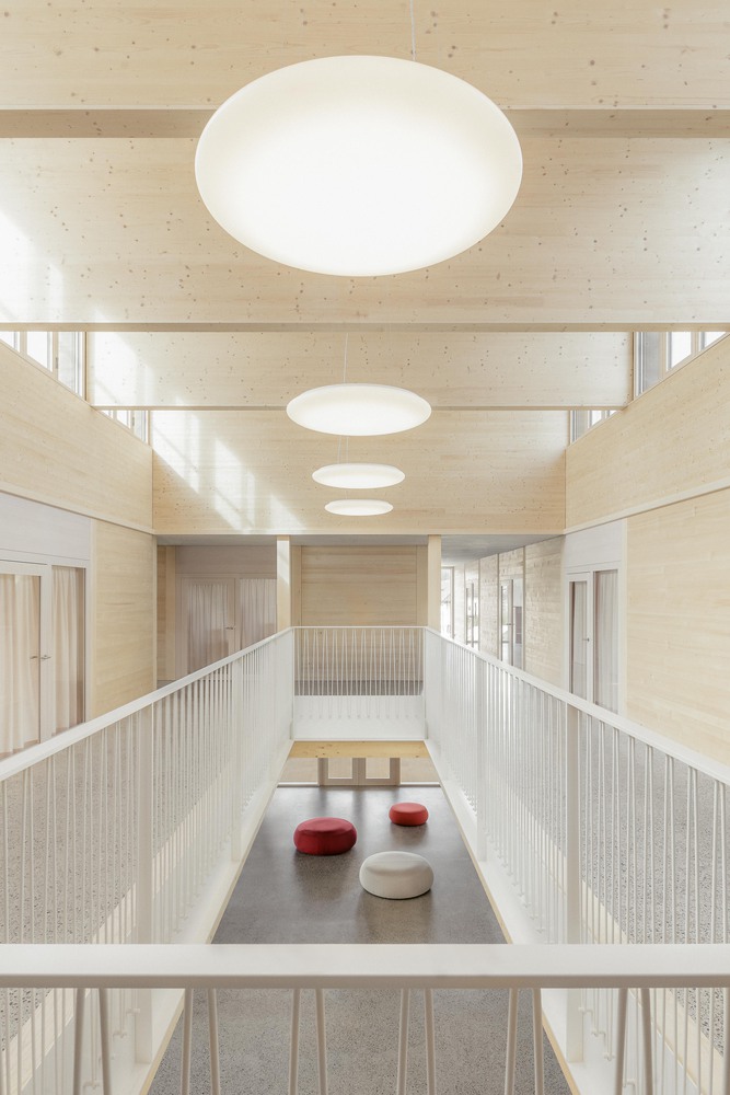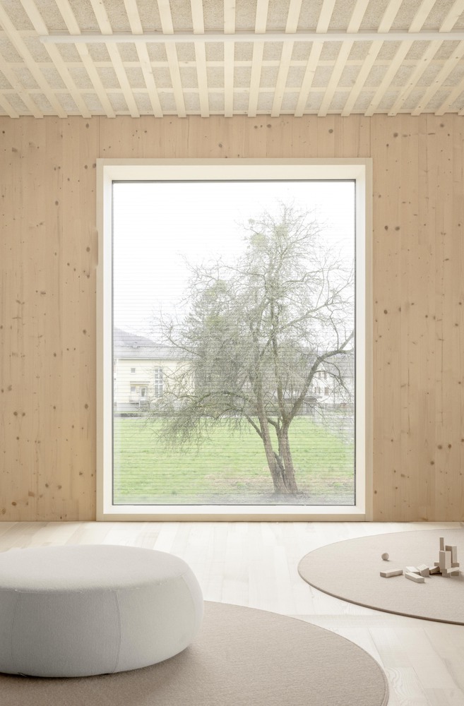 幼儿园以木质 pavilion 为主体,立面采用充满童趣的结构设计,交替形成壁龛与实体墙面,赋予建筑轻盈感。立面的天然木材会随时间形成独特包浆,使建筑在社区中自然扎根。材料与设计理念深受教育者和儿童对舒适与宁静的需求影响:室内采用未处理的实木表面,营造温馨宽敞的房间;搭配柔软的天然织物窗帘与坚固的水磨石地面(经得起孩子们嬉戏打闹),共同构成和谐整体,全面满足教学与儿童需求。