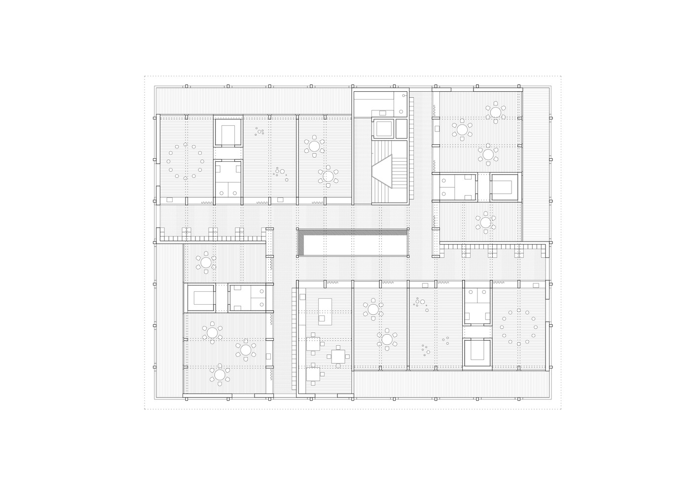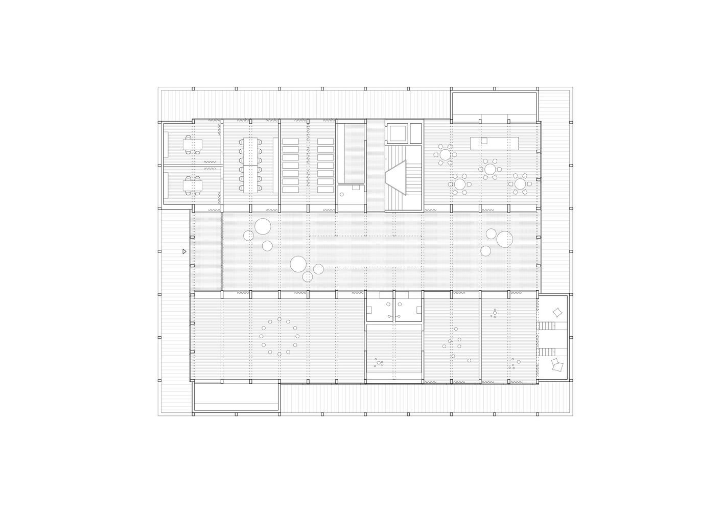 二层将所有儿童保育小组平等分布在同一平面,走廊提供充足的活动空间。超高的中央空间配有天窗和天井,形成两层之间的视觉连接,强化了建筑的交流属性。上层同样环绕着露台,将室内空间延伸至户外,成为气候防护下的户外游戏区。