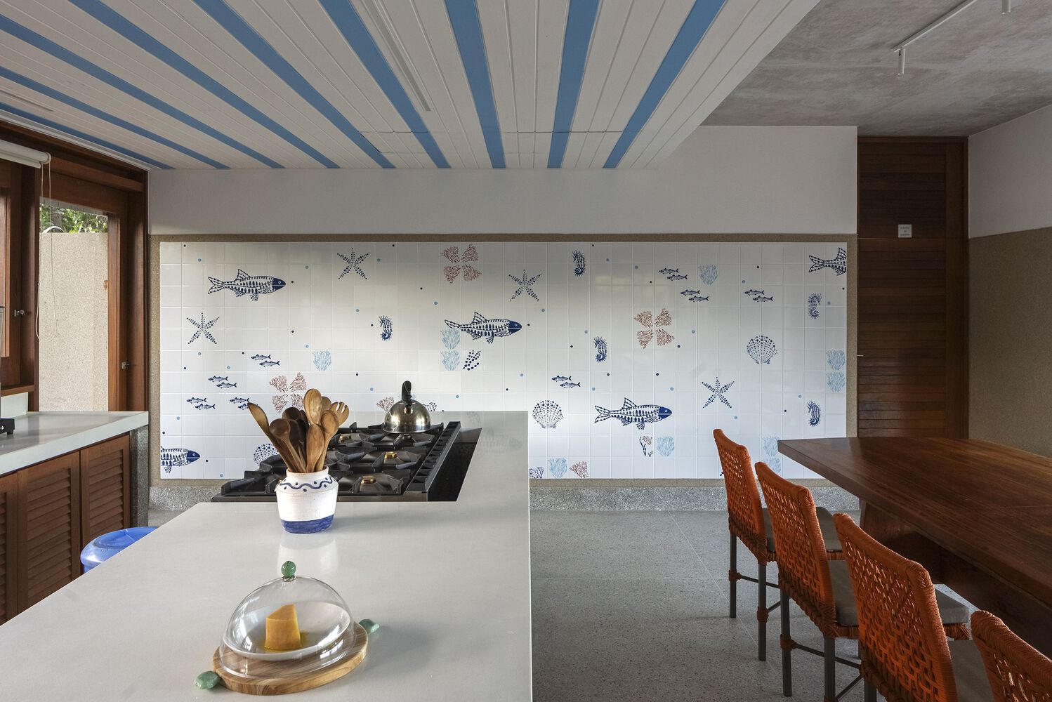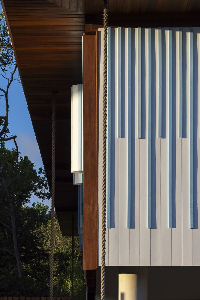 木质立面是一个由连接盖板构成的建筑与装饰系统,其灵感源自帕塔肖(Pataxó)文化、凯萨拉(caiçara)文化,也融合了南部文化元素,具有多元的起源。其色彩处理是对伊曼贾(Iemanjá,非洲裔巴西人信仰中的海洋女神)的致敬。