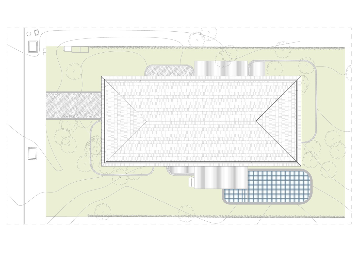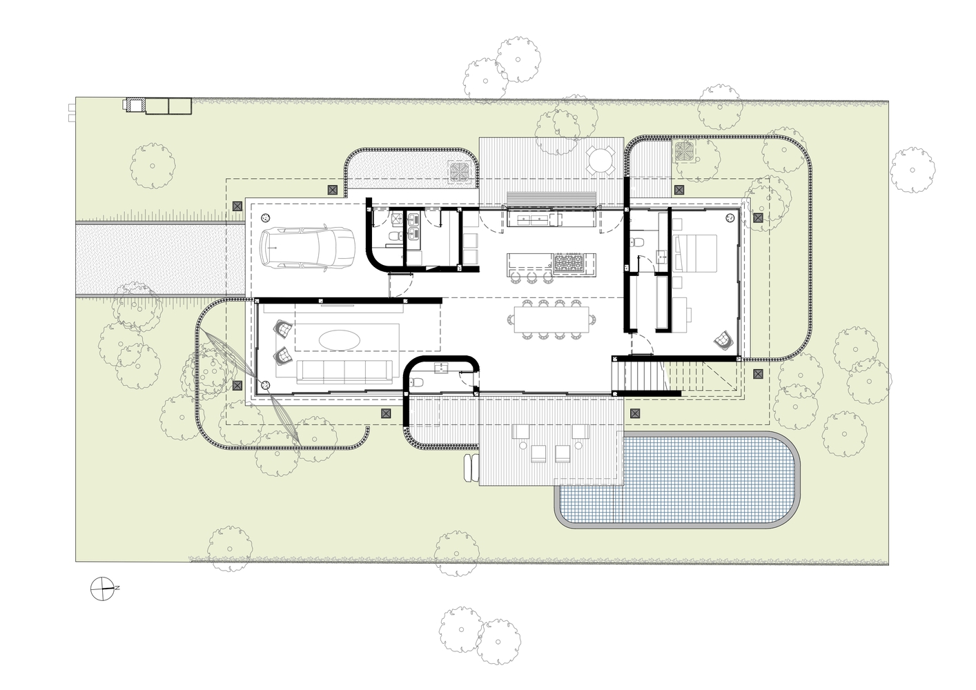 这座房子的落成承载了诸多回忆与情感。一楼更具社交属性,采用开放式布局,与后院、泳池和森林相连,带围栏的庭院中还设有私人花园。