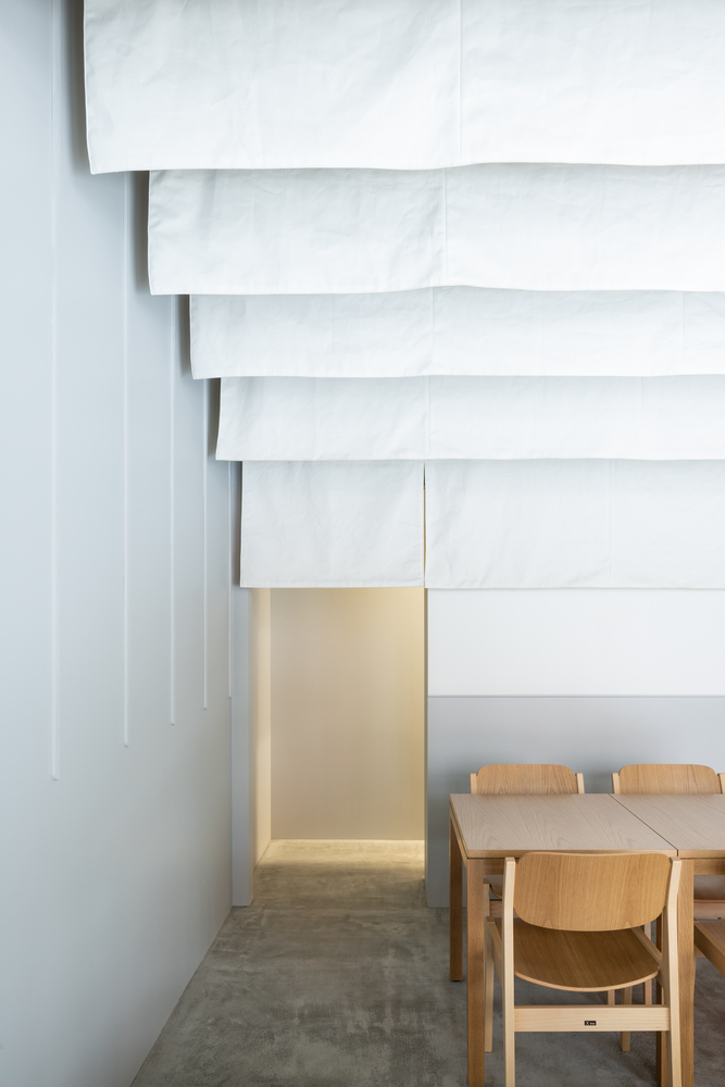 窗帘的前后两面由不同颜色的帆布制成,每一面的长度随着向后移动而增加。越往后,每一面的长度越长。这样,当你从街上经过餐厅时,以及当你就座或用餐完毕离开餐厅时,都会有不同的感觉。设计的目的是在用餐区营造一种空间感,因为用餐区往往是一个固定的背景。与坚硬、一成不变的墙面不同,“noren ”在人们实际移动时会缓缓摆动,从而营造出一种更加轻松的氛围。