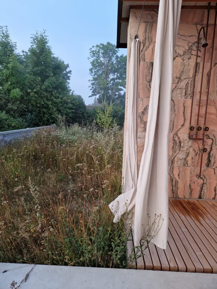 这座住宅是精致而宁静的创作,同时兼具趣味元素:浴室采用粉杏色大理石水磨石装饰,卧室天花板上绘有一幅巨大的蓝色壁画,描绘了藤蔓、猴子和鸟类。巨大的落地窗将主屋朝向波罗的海完全敞开,海水的流动、地平线上的小岛以及自然元素构成了宁静却不断变化的景观。混凝土、受周边景观启发而精心处理的松木,以及灰泥的组合,营造出室内空间的静谧氛围。项目的内外墙壁色彩,呼应着房屋与海洋之间被阳光炙烤的田野。