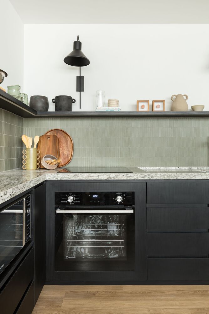 宽大的窗户让充足的自然光涌入,窗下的混凝土长凳连接起客厅和餐厅,还提供了储物空间,方便接待访客时使用。相邻的厨房与其他空间风格一致,其特点是绿色陶瓷饰面贯穿整个区域,增添了美感与个性。装饰元素融入了巴西特色与复古韵味,柔和了空间简约的美学风格。