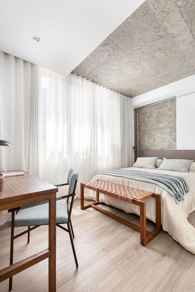 空间的特点在于采用了能体现工业与现代风格的材料,如结构所用的混凝土和染色木材。客厅裸露着管道,配备了定制家具,还有一张宽敞的浅色沙发,带来舒适体验。带有纹理的手工元素为空间增色,使其更显轻盈温馨。