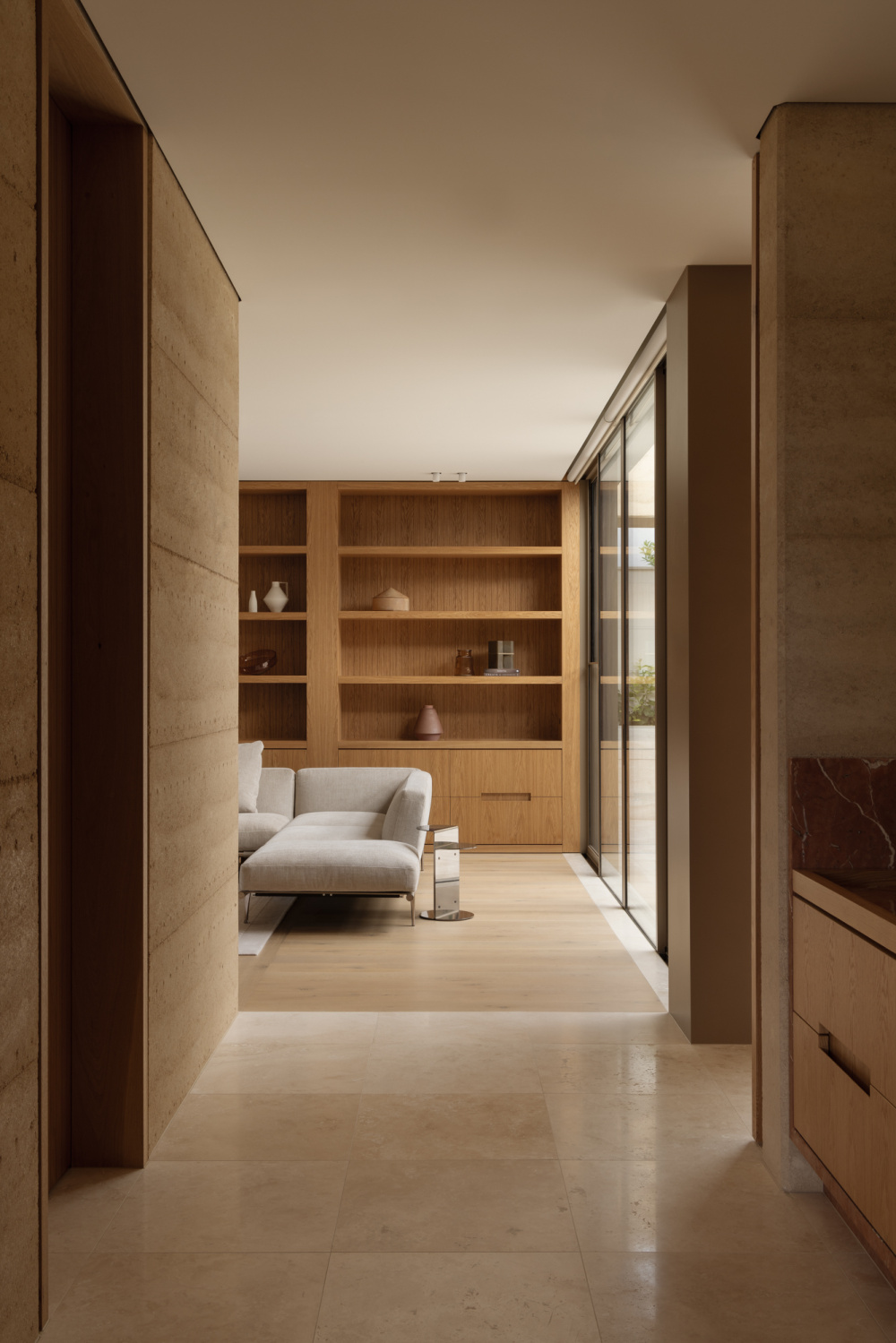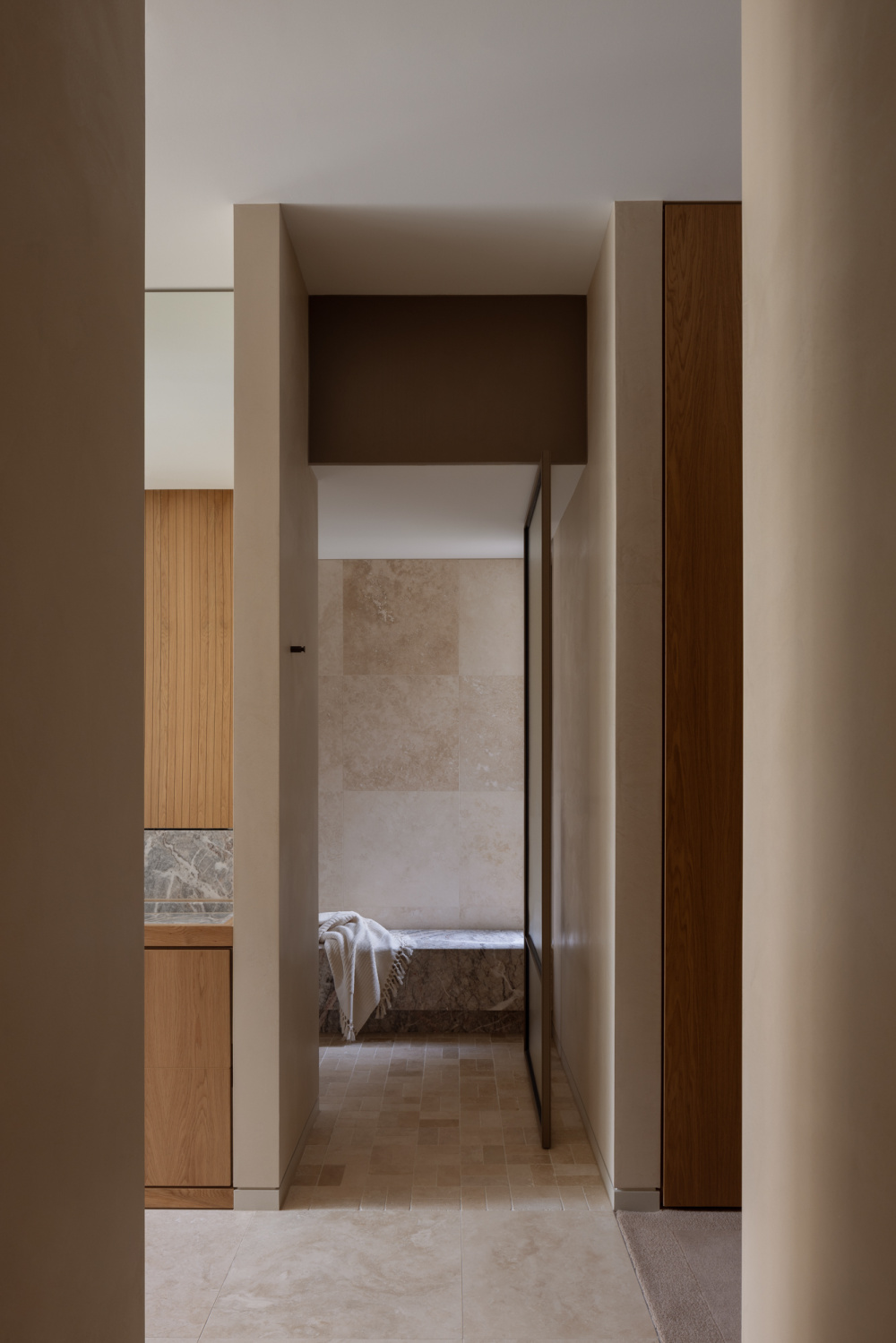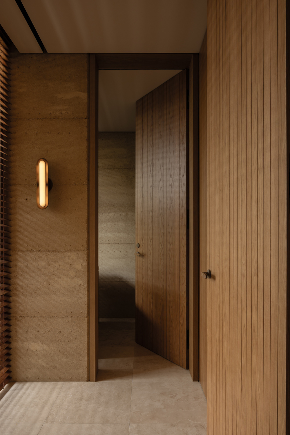 在这座住宅中,光线不仅是“照明工具”,更是空间的“柔化剂”。设计通过界面通透度的控制与人工光的隐藏式设计,让自然光与人工光形成柔和对话,为空间注入呼吸感与生命力。自然光的引入采用“分层策略”,让不同界面的光线形成互补。庭院侧的通高玻璃引入充足的漫射光,这种光线柔和均匀,不会产生强烈阴影,让客厅、餐厅等公共区域始终保持明亮通透;临街侧的格栅则过滤出“斑驳的光影”,阳光穿过格栅缝隙,在混凝土墙面与橡木地面上投下移动的光斑,为空间增添了时间的韵律。清晨,庭院的晨光先唤醒卧室;午后,格栅的光影在客厅缓缓移动;傍晚,街灯的光线透过格栅与玻璃的叠加,形成“都市与自然的光影交融”,让空间的光线层次始终丰富而柔和。人工光的设计则遵循“隐形化”原则,避免灯具破坏空间的质感。嵌入式筒灯隐藏在天花板的缝隙中,仅在需要时投射出局部照明;橡木柜体的内部与底部暗藏灯带,打开时能照亮柜体内部的物品,同时在地面与墙面形成柔和的光晕,弱化了空间的边界感;卧室的床头壁灯采用“壁龛式”设计,灯光从木作壁龛中透出,既满足阅读需求,又不会直射眼睛,营造出静谧的睡眠氛围。这种“隐藏式人工光”与“自然漫射光”的结合,让空间在夜晚依然保持通透与柔和,延续了白天的松弛感。