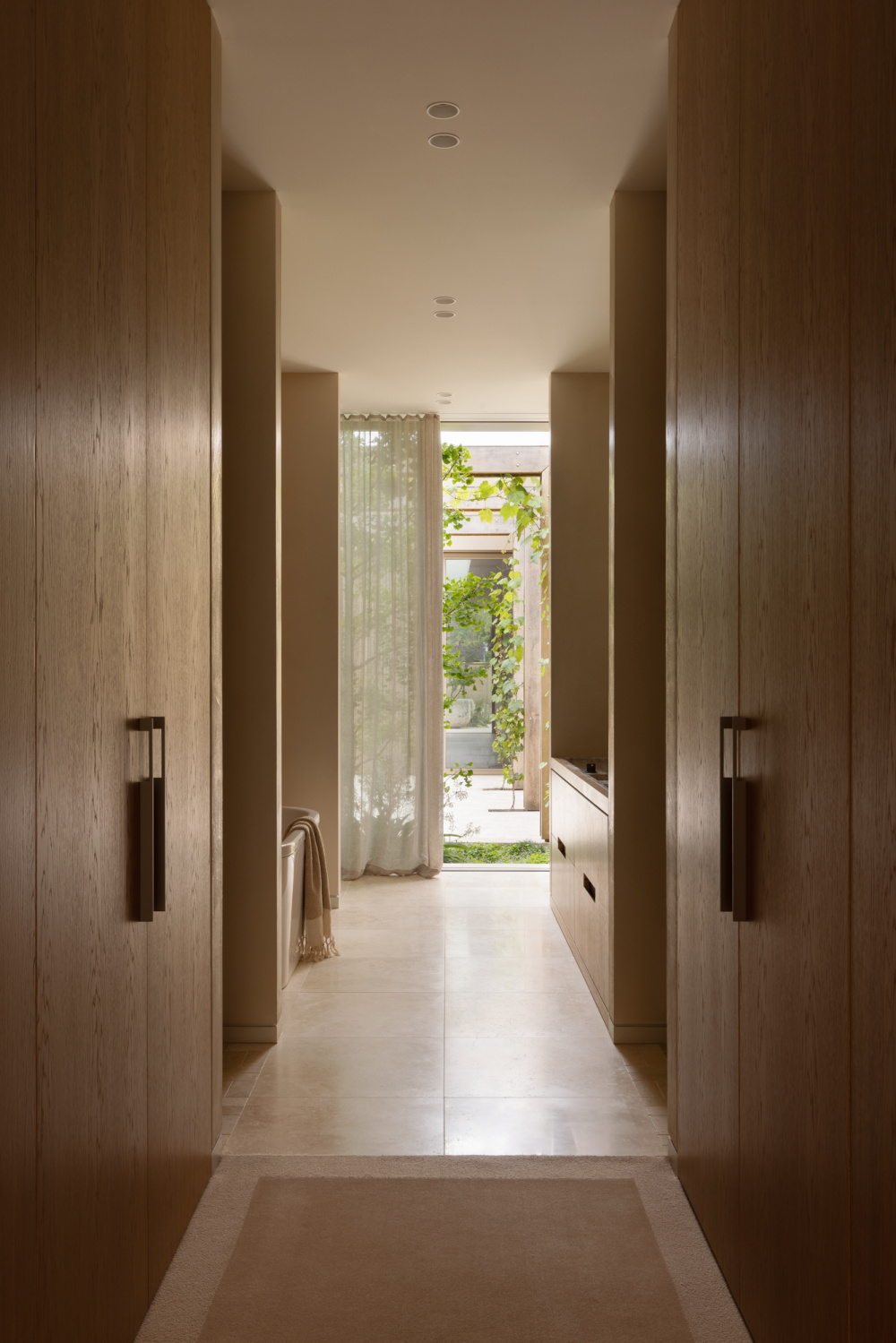 转向庭院的一侧,界面则完全“卸下防备”。通高的玻璃幕墙取代了实体墙体,将庭院的绿植、天光与微风毫无保留地纳入室内视野。春日的新叶、夏日的浓荫、秋日的落叶、冬日的暖阳,都成为室内的“动态装饰”;清晨的鸟鸣与傍晚的虫吟,打破了都市的寂静,让“都市里的私享自然”成为日常。这种“前隐后透”的布局,让住宅在都市中“隐”得从容,“透”得自在,实现了公共性与私密性的完美平衡。