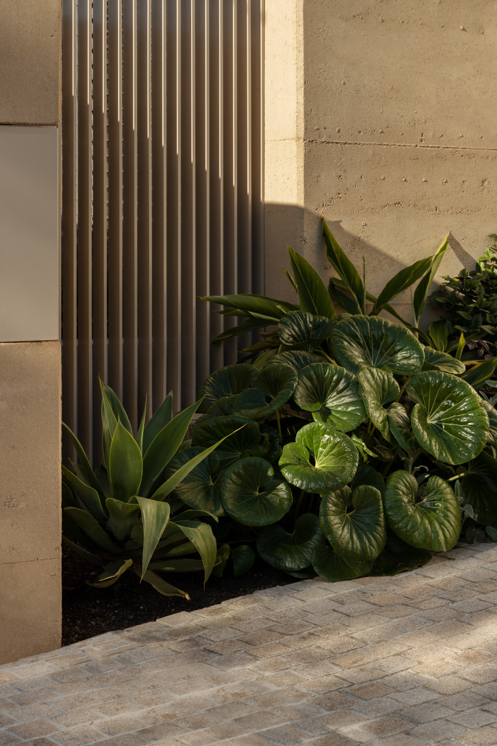 面对都市街道的公共性与生活所需的私密性,住宅以“前隐后透”的双面界面策略,完成了与城市的温柔对话。这种界面设计并非简单的“封闭与开放”对立,而是基于都市语境的精准回应——既保持与公共空间的恰当距离,又为内部生活预留自然渗透的通道。临街一侧,厚重的混凝土立面是住宅的“都市铠甲”。竖向格栅与实墙的组合,以“半遮蔽”的形式构建起隐私屏障,行人无法窥探室内细节,却能透过格栅的缝隙,瞥见墙面的肌理与光影的变化。这种设计弱化了混凝土的厚重感,让建筑在街道中既不张扬,又以独特的光影韵律融入都市肌理。格栅的间距经过精准计算,正午时能过滤强光避免室内过热,傍晚则让街灯的光线柔和地渗入,形成“都市光影的自然过渡”。