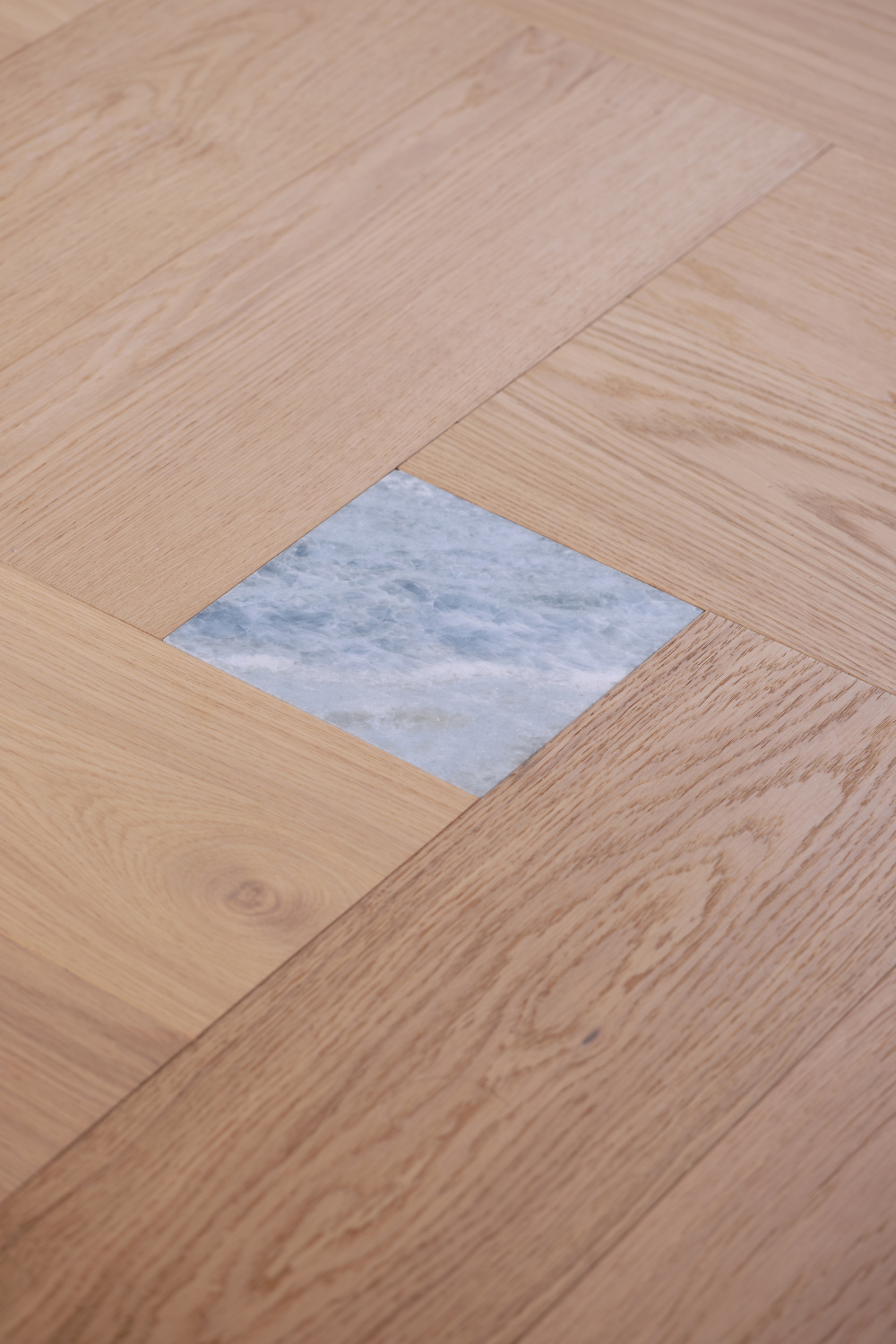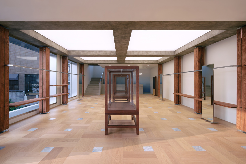 材质的选择以 “可触摸的温暖” 为核心,通过天然材料的本真质感,呼应内衣的柔软与私密。软木面板与铸金属挂钩的组合,将每一件内衣单品都打造成展品般的存在,既解决了传统陈列杂乱的问题,又以软木的温润触感中和了金属的冷硬,传递出 “温柔而坚定” 的质感。天蓝色大理石镶嵌的风车纹橡木地板,是材质设计的点睛之笔。橡木的温暖纹理与天蓝色大理石的冷冽质感形成对比,既增添了空间的层次,又赋予其象征意义 —— 风车纹的传统图案呼应韩屋文化,天蓝色则暗合 “青烟” 意象,平衡了手工质感与现代精准度。混凝土楼梯与柜台作为一个雕塑般的整体,以粗粝的原始质感成为空间的视觉核心,自然引导人流动线,与木质、软木的温润形成 “冷与暖” 的材质对话。所有天然材料均保留原始质感,允许其随时间自然老化,让空间在使用中不断演变,如同青烟的形态般自由生长。这种 “不刻意修饰” 的材质理念,既延长了建筑的使用寿命,也让空间承载了更多时间的痕迹,与北村地区层层叠叠的历史印记形成呼应。