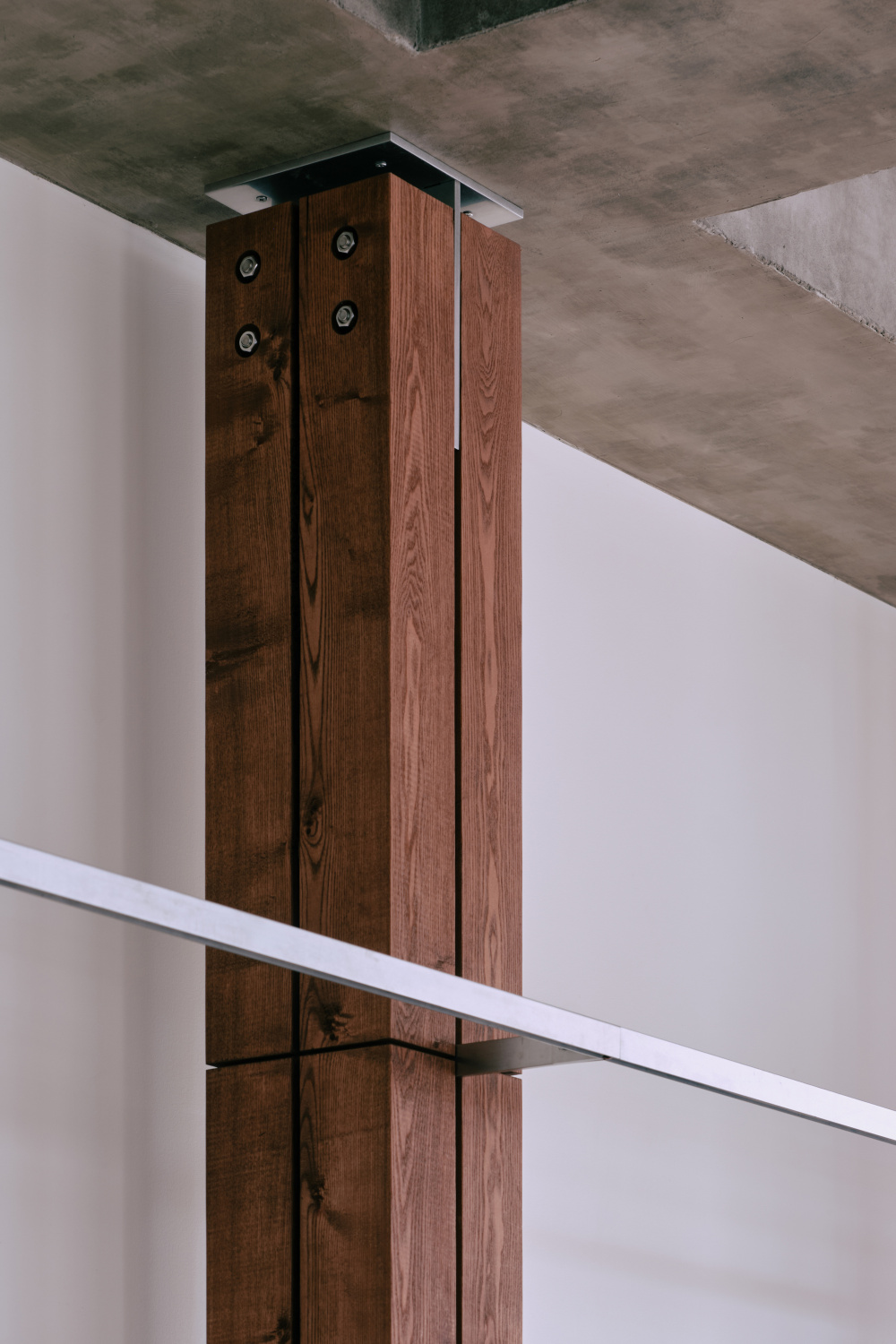 设计深度借鉴传统韩屋的建筑智慧,将木柱结构以现代形式重新演绎,打造出兼具功能性与韵律感的空间骨架。这套贯穿上下两层的立柱系统,不仅实现了空间的视觉统一性,更整合了衣架、镜子、照明和隔断等多重功能,让结构与功能无缝融合。木柱的排列遵循韩屋建筑的秩序感,却以更轻盈的比例与更简洁的线条,适配现代零售的需求。立柱之间的空隙自然划分出陈列区域,既避免了墙体分隔的生硬,又让空间保持通透流动,如同韩屋的 “廊下”,引导顾客自然游走。这种设计既延续了北村韩屋村的建筑基因,又赋予其现代零售的实用属性,让历史语境与当代需求和谐共生。