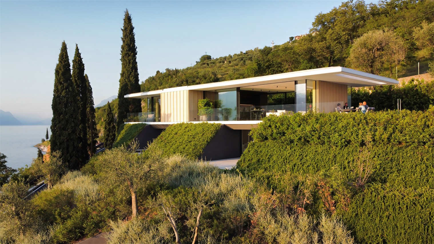 德拉戈住宅(Residência Dellago)是一座湖边度假别墅设计,坐落于意大利加尔达湖东岸的自然景观之中。地形形态为项目设计提供了方向指引:建筑依托于一块天然台地,该台地与湖泊平行,在场地地形中清晰可辨,且位于一片紧凑区域内,最大程度减少了挖掘作业和土方搬运。