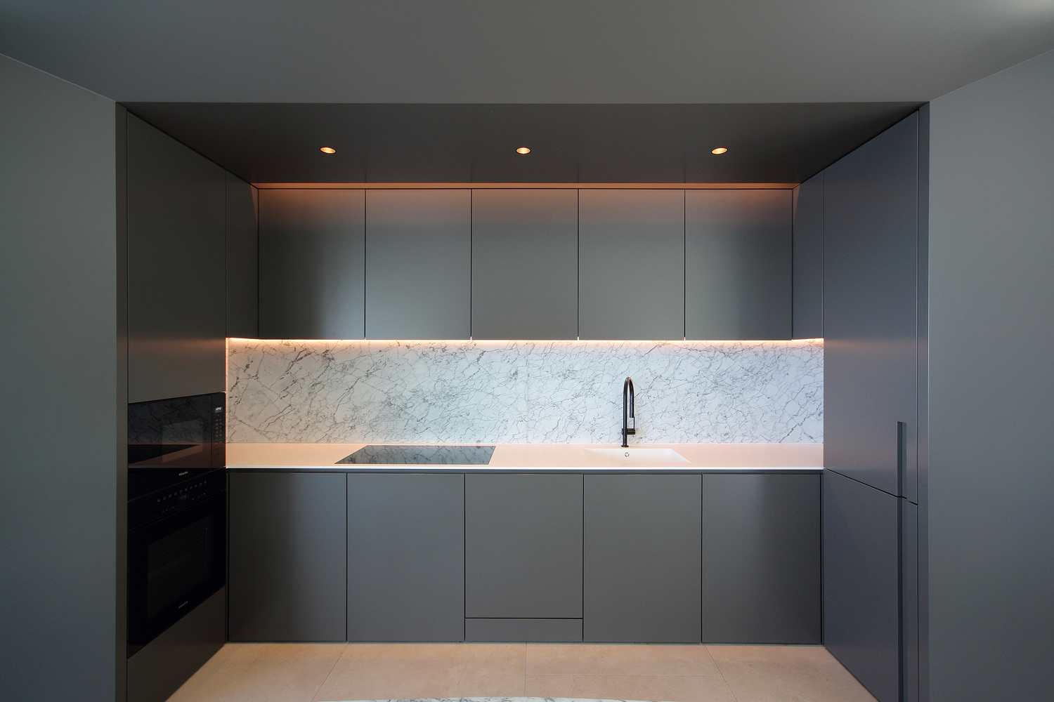 室内配有全定制的固定家具,例如覆盖墙面的橡木面板、浴室里的大理石台面,以及整合了多种技术设备的开放式厨房。家具在空间中仿佛悬浮一般,增强了采光效果,也强化了室内的现代风格。卷帘式窗帘完美嵌入天花板边缘,既能保障隐私,又能从外部过滤视线。