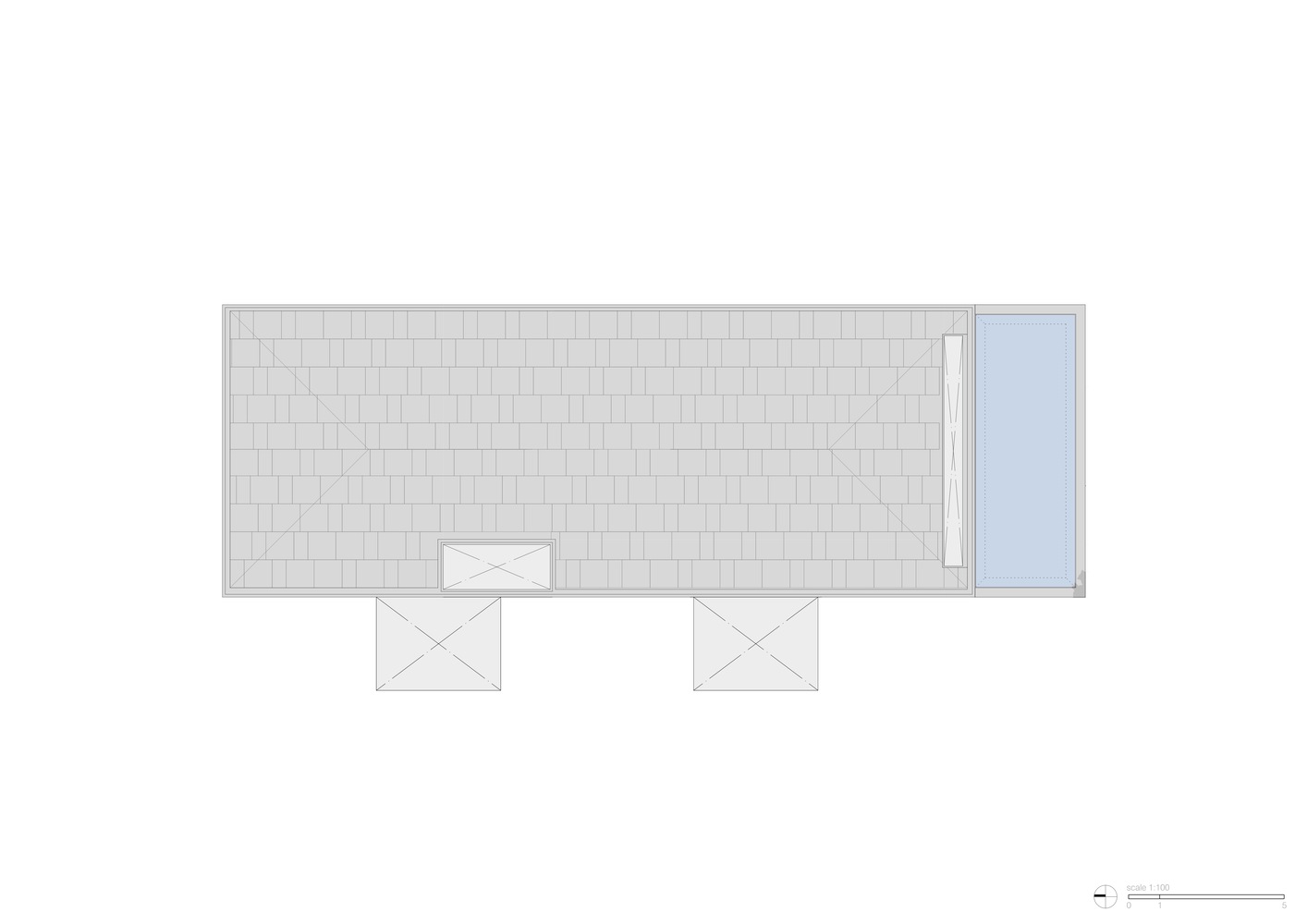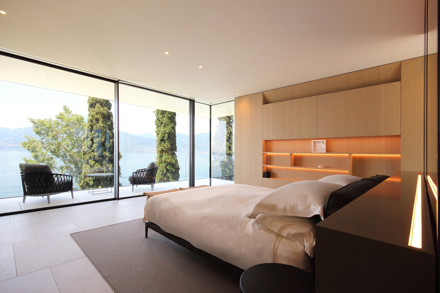 主楼层的立面大面积采用玻璃幕墙:所有房间都能毫无遮挡地观赏湖景,使这座展馆式住宅显得轻盈通透。平屋顶向四面悬挑,建筑高度略超 3 米,在光影之间营造出理想的平衡,促进住宅与周边植被的完全融合。屋顶表面的设计如同立面一般精心:技术组件被隐藏起来,饰面采用浅灰色陶瓷材料。