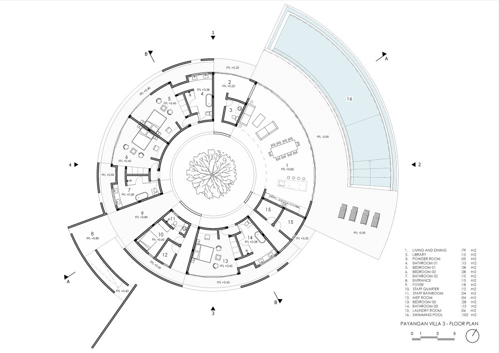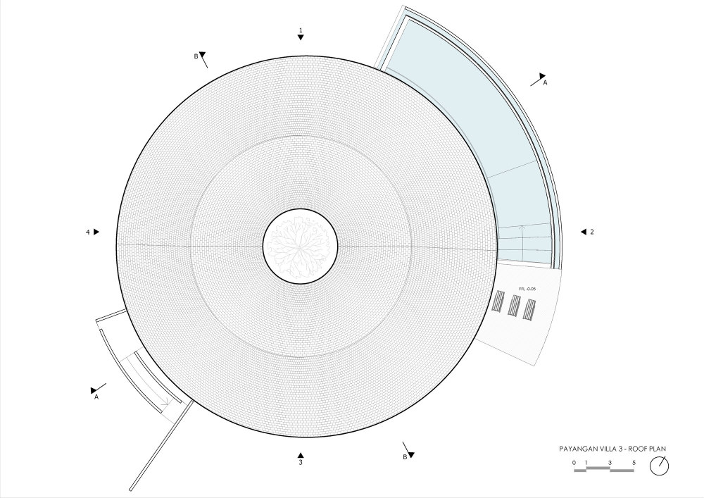 设计的核心突破,在于以 “环形穹顶 + 中央内院” 的形态,打破了建筑与自然的二元对立。直径数十米的穹顶以舒展的弧形覆盖整个场地,既呼应了雨林地貌的曲线肌理,又以巨大的体量形成 “人工树冠” 的意象;而穹顶中央的圆形开口,如同为自然预留的 “呼吸口”,让天空、绿植与光线直接渗入空间核心,使内院成为整个住宅的生态与视觉枢纽。这种形态并非形式的刻意,而是对热带气候的适应性回应:弧形屋顶最大化分散了降雨的冲击力,深色瓦片状的屋顶材质则在湿热环境中兼具耐久性与自然质感;中央内院的通风效应,让穿堂风可贯穿整个居住空间,替代了机械空调的部分功能,实现了生态与舒适的平衡。