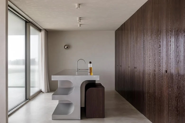 “无限之居”(Infinitum)是一座俯瞰北海的海滨住宅,在这里,全景视野与定制设计相得益彰。所有的家具、艺术品和装饰物件都经过精心制作,既与室内风格相匹配,又优化了空间和功能。在厨房里,一面光滑且经过深度打磨的橡木墙隐藏了电器、吧台橱柜,甚至还有食品储藏室的入口,保持了一种无缝且极简的美学风格。不锈钢早餐吧台区域搭配定制的橡木吧凳,在提升实用性的同时,也与厨房岛台流畅的线条相呼应。