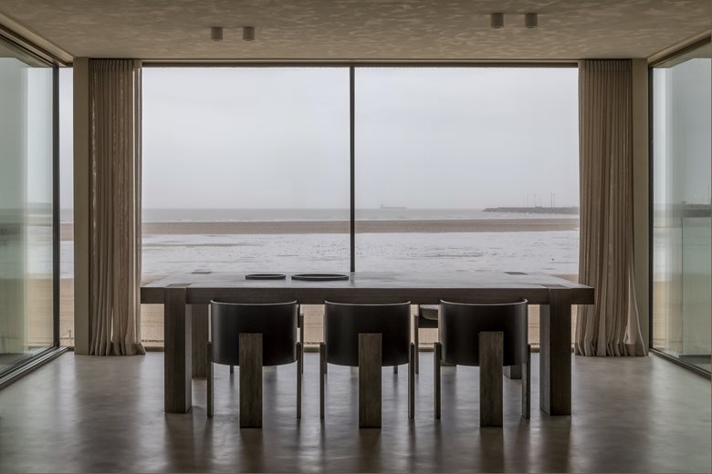 一张大型的定制餐桌放置在玻璃延伸区域内,可提供 180 度的海滩全景视野。桌面由定制的石灰水磨石制成,呼应了海岸景观,它放置在一个双色、经过钢丝刷处理的橡木结构上,并搭配了弧形三脚架餐椅。