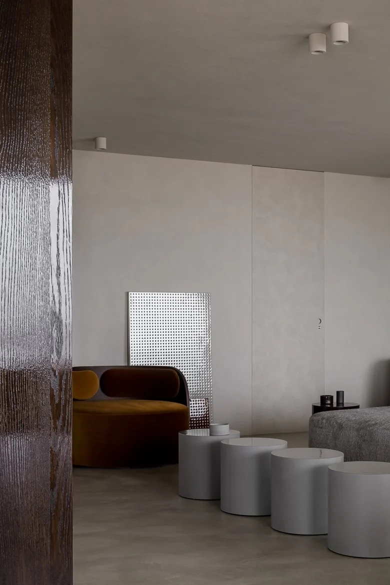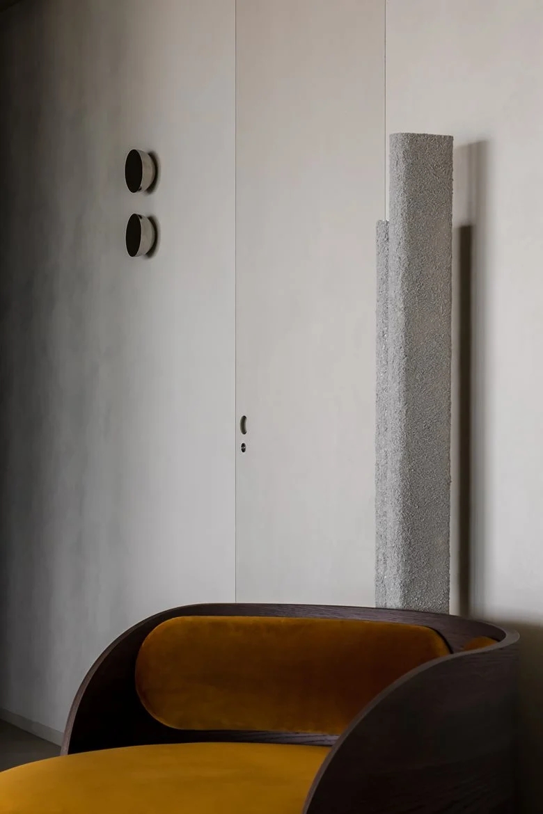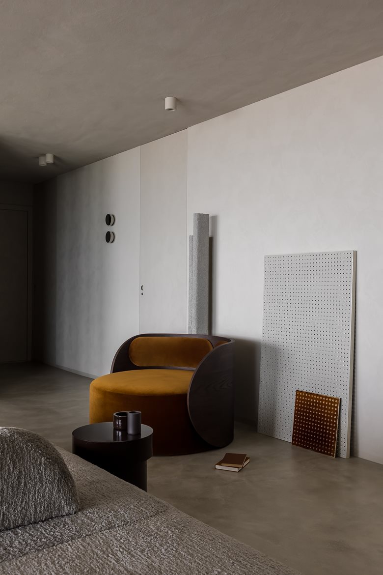 卧室和浴室的空间较为紧凑,再加上极简的布局和对功能性的高度关注,需要创新的节省空间的解决方案。每一个元素的设计都是为了保持宽敞的空间感,并维持极简的美学风格。整个公寓采用了以石灰为基础的无缝地板,而墙壁、天花板和灯具则覆盖着粗颗粒的油漆饰面。温暖的浅灰色调,与深棕色和姜黄色 / 焦糖色的点缀形成对比,并通过拉丝不锈钢加以突出。