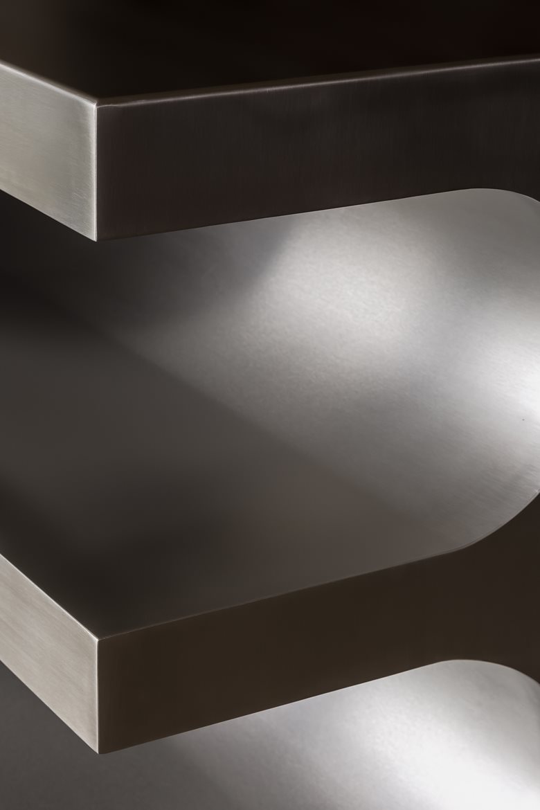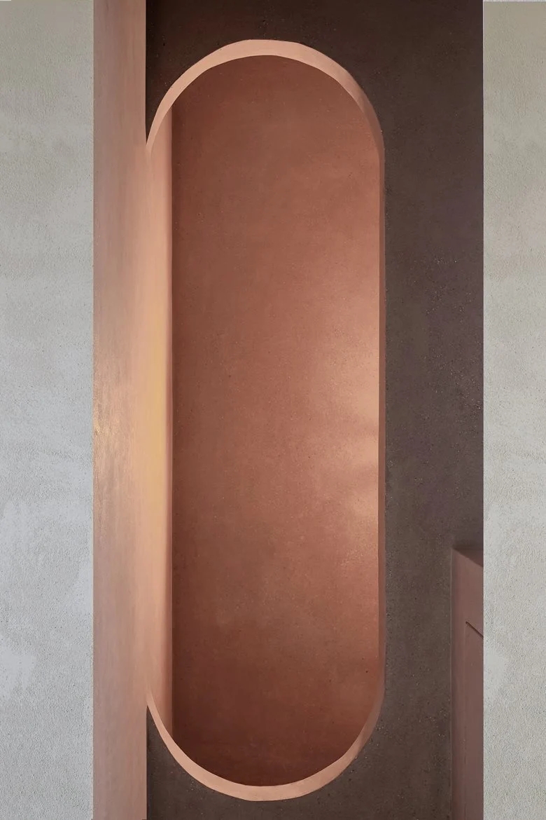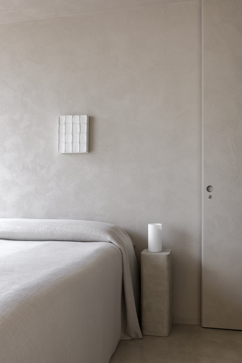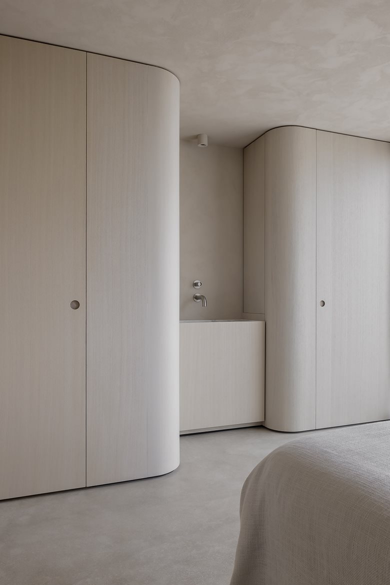卧室和浴室的空间较为紧凑,再加上极简的布局和对功能性的高度关注,需要创新的节省空间的解决方案。每一个元素的设计都是为了保持宽敞的空间感,并维持极简的美学风格。整个公寓采用了以石灰为基础的无缝地板,而墙壁、天花板和灯具则覆盖着粗颗粒的油漆饰面。温暖的浅灰色调,与深棕色和姜黄色 / 焦糖色的点缀形成对比,并通过拉丝不锈钢加以突出。