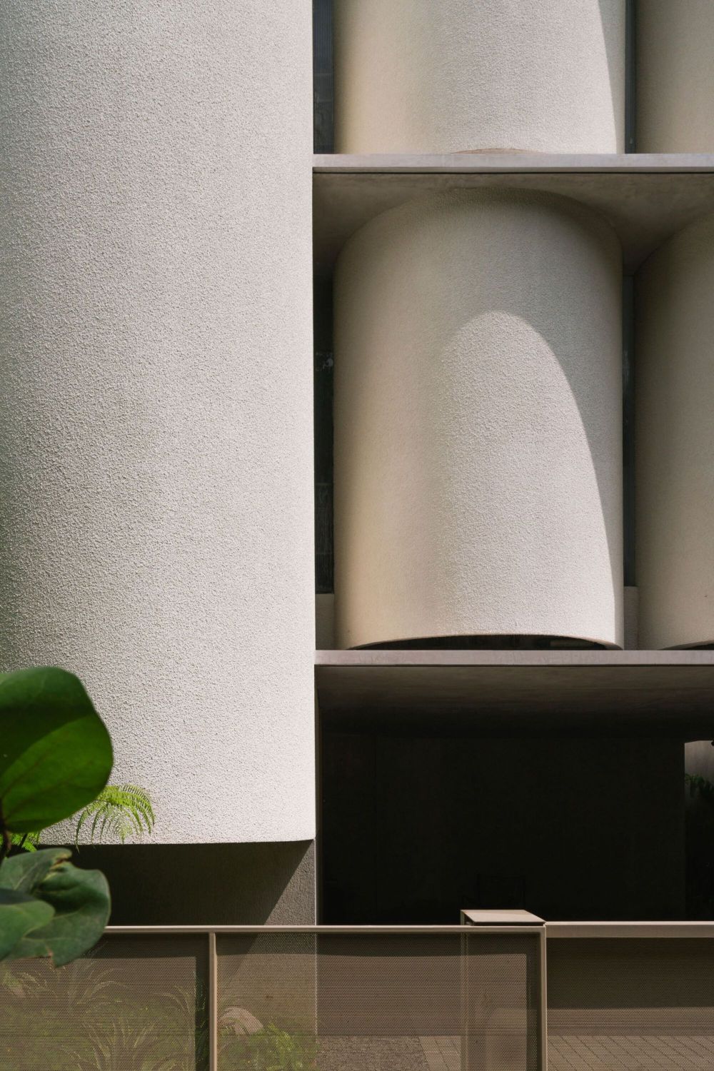 建筑外立面以 “圆柱形元素” 为视觉核心 —— 底层入口的圆柱既是结构支撑,又以 “连续排列的形态” 形成如同 “音乐节拍” 的韵律感,与周边建筑 “直线硬角” 的单调形成鲜明对比;上层阳台的圆柱护栏延续这一语言,让建筑轮廓在街道视角中呈现 “柔和的弧形起伏”,如同 “为坚硬的混凝土披上流动的外衣”。这种重复的几何元素,既强化了建筑的 “视觉记忆点”,又通过 “无棱角的形态” 传递出 “亲和、包容” 的共居气质,吸引居民主动靠近;