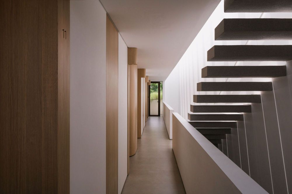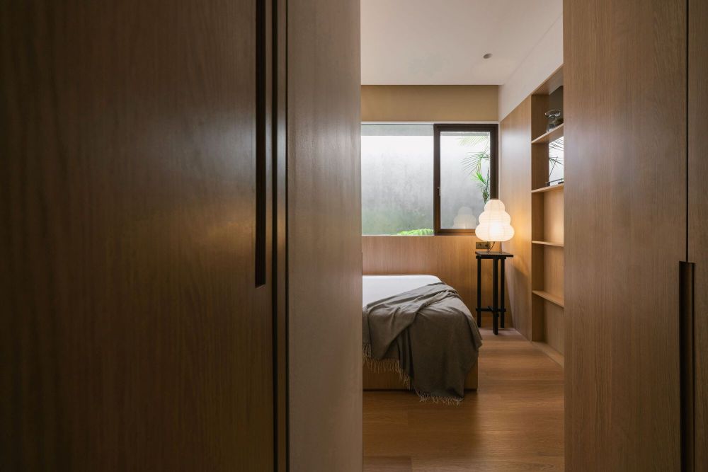 室内以 “白色、米色、浅木色” 为中性主调,白色墙面反射自然光,让紧凑空间更显明亮通透;米色软装(沙发、床品)则为不同材质的 “对话” 提供 “柔和背景”,避免高饱和色彩的视觉疲劳。整体色彩如同 “画布”,让 “混凝土的粗粝” 与 “木材的温暖” 都能得到充分展现,同时让居住者感受到 “平静、舒适” 的情绪氛围。纵向三段式布局(楼梯 – 走廊 – 客房)让 “动线最短化”—— 居民从楼梯到客房无需迂回,提升使用效率;客房内部则 “去繁就简”,根据三种户型的需求,将床、衣柜、书桌等家具 “紧凑且有序排列”,同时通过 “弧形墙面” 与 “局部开窗”,避免 “拥挤感”,确保 “独立卫浴 + 基础生活功能” 的舒适体验;