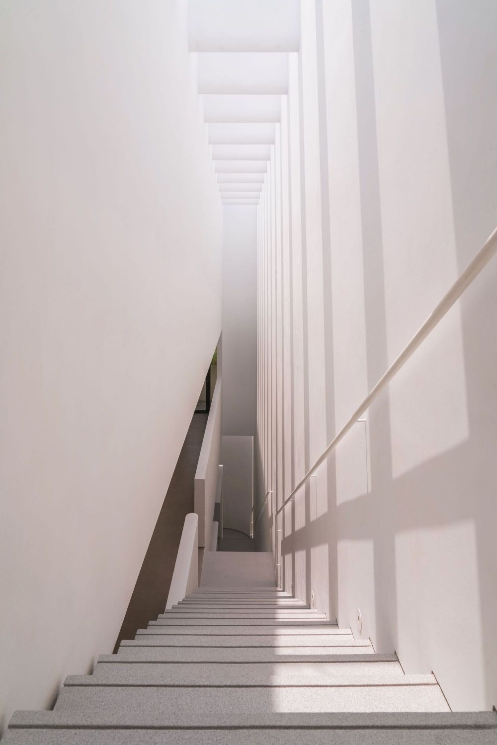 曲线并非停留在立面装饰,而是 “穿透建筑表皮,融入内部每一处空间”:入口处三层通高的楼梯间,墙面粉刷成 “柔和的弧形曲面”,配合顶部天窗的天光,让 “垂直交通空间” 从 “单调的过道” 转变为 “带光影变化的艺术廊道”;客房与公共走廊的隔断采用 “微微内凹的弧形”,既增加了走廊的 “呼吸感”,又让客房内部空间显得更开阔,避免了 “直线隔墙带来的局促感”,让居住者在紧凑的房间内仍能感受到 “空间的延展性”。