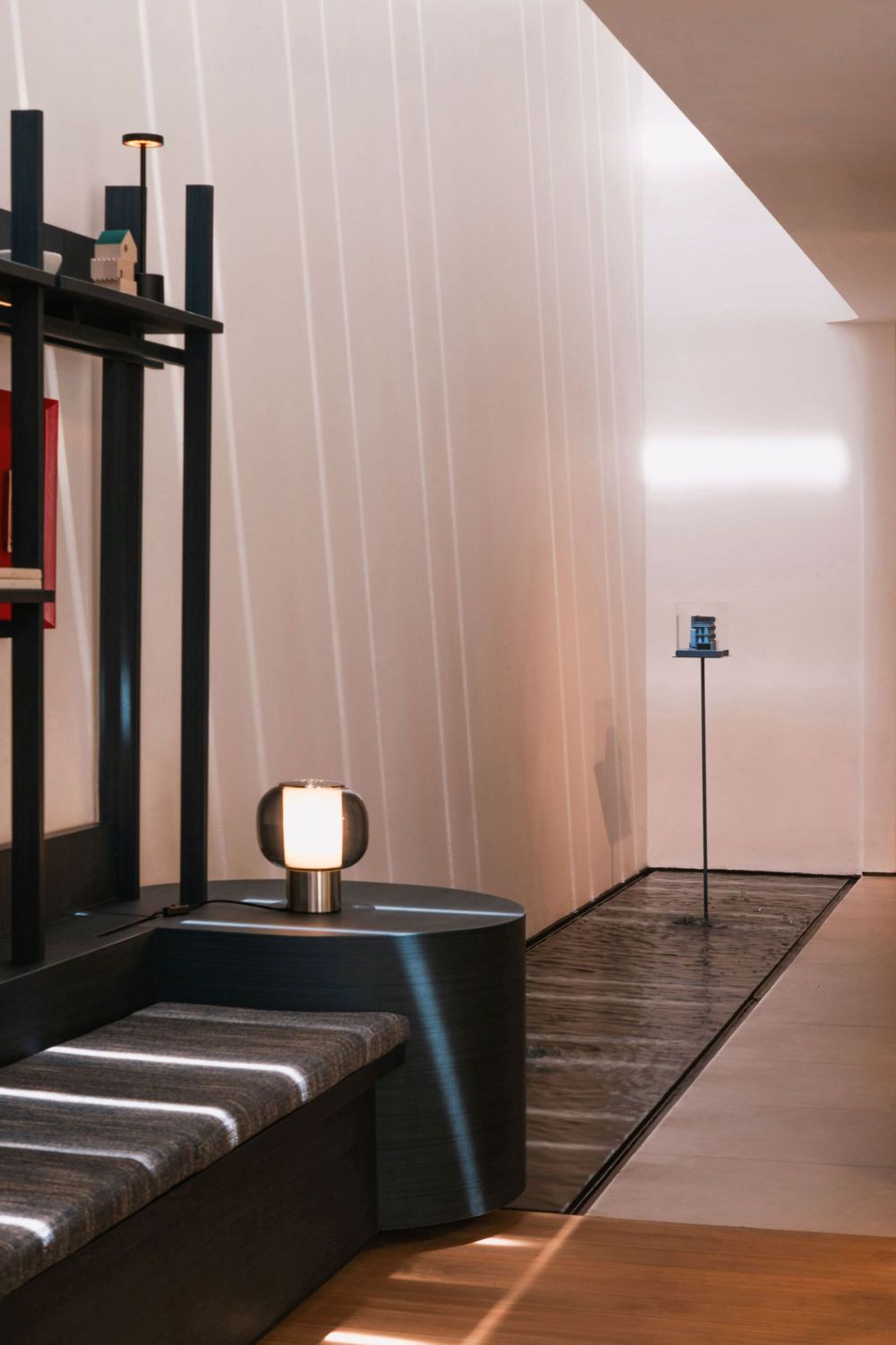 入口三层通高空间是 “光影互动的核心舞台”—— 顶部天窗引入的自然光,随时间推移在弧形墙面投射出 “流动的光影轨迹”,如同 “天然的时间刻度”;下方的狭长镜面水景则 “放大这一效果”,水面将天光、墙面光影 “二次反射”,让整个入口区成为 “光影流动的剧场”。居民进出时,既能感受到 “时间与空间的互动”,又会因 “共同驻足欣赏光影” 而产生自然交流,为 “邻里关系” 埋下温暖伏笔;