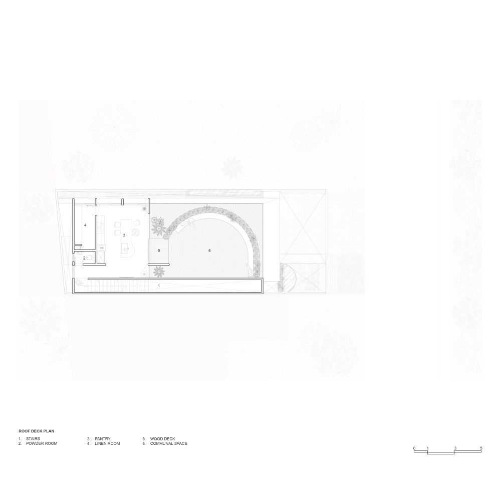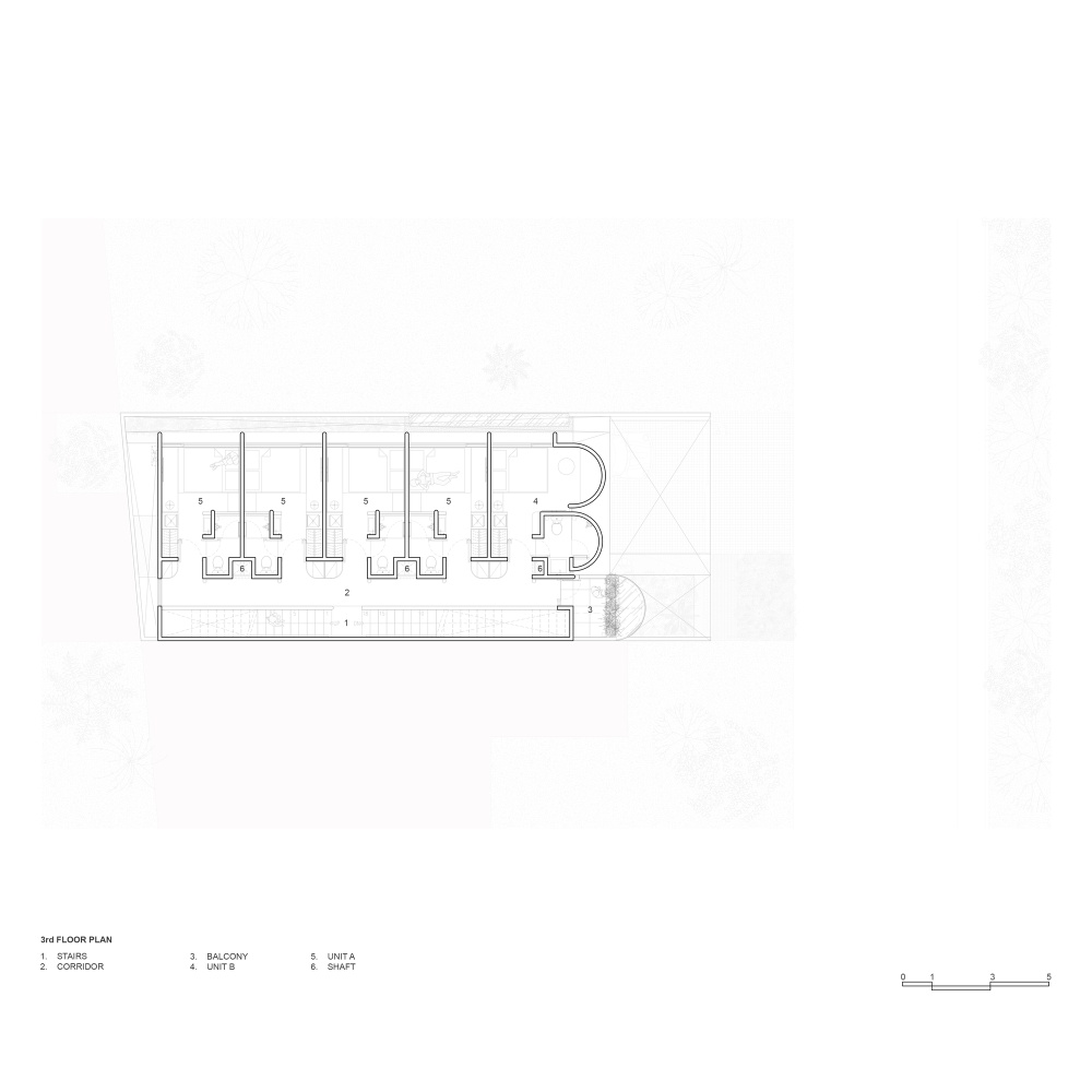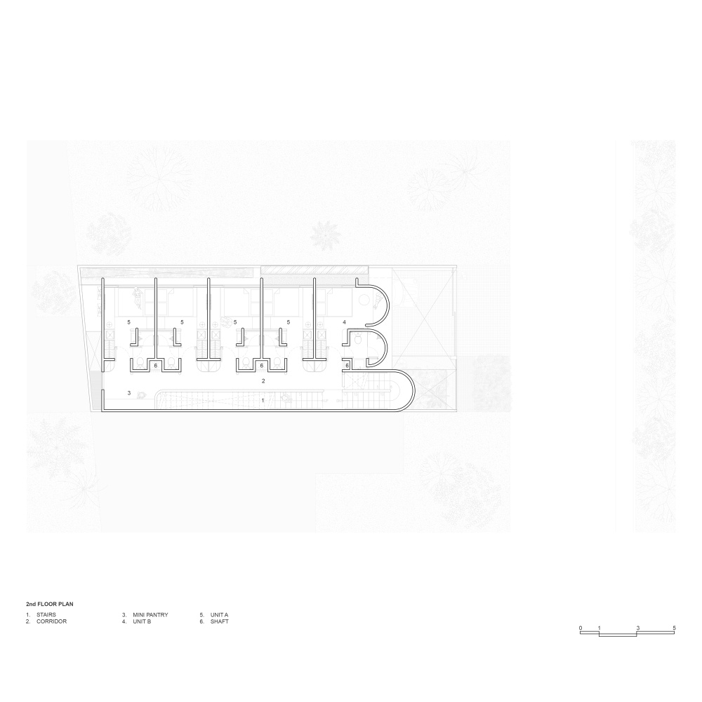 建筑采用 “纵向三段式布局”(楼梯 – 走廊 – 客房),看似规整,却通过 “细节设计” 模糊 “公共 – 私密” 的边界:走廊护栏部分采用 “悬空断开的弧形墙”,既保障安全,又让 “走廊” 与 “客房” 形成 “视觉穿透”—— 居民在走廊行走时,能透过断口 “瞥见客房内的生活片段(如阅读的身影、床头的暖光)”,这种 “半遮半掩” 的视觉互动,既保护了客房隐私,又避免了 “陌生人之间的完全隔绝”,让 “邻里间的默契问候” 成为可能;屋顶公共区则以 “开放布局” 设置小型储物与休闲空间,邀请居民在此 “共享烹饪、午后闲聊”,让 “共居” 真正成为 “共享生活的社区”。
