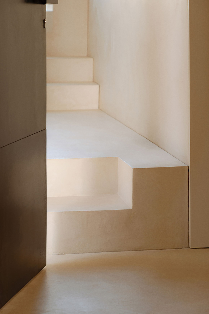 在材料选用方面,项目采用了中性色调和高档材料。内部的微水泥覆盖了墙面、地面和天花板,与立面的石灰相呼应,贯穿所有空间,使项目形成连贯的整体。天然橡木用于厨房家具的内部木工以及二层卧室的地面,营造出更温馨的氛围。最后,天然石材被用来强调厨房中岛和洗手池的厚重感,它们几乎被打造成了雕塑般的作品。