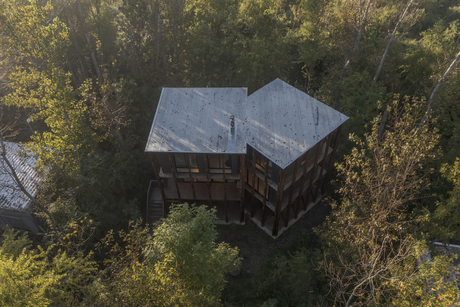 建筑的上部空间以 “两个相互连接的立方体” 为核心形态 —— 这种简洁的几何造型,在野性的自然环境中显得格外清晰,却又因木材的温润质感,不显得冰冷突兀,完美诠释了 “既彰显存在感,又不支配自然” 的设计理念。