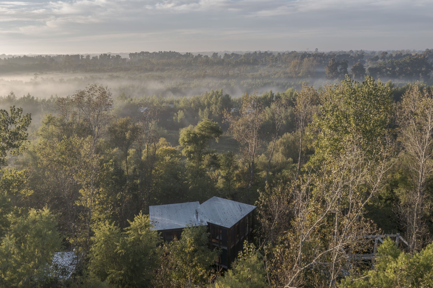 该森林度假屋设计在巴拉那河与乌拉圭河交汇的野性之地 —— 河水奔涌汇入拉普拉塔河,湿地与零星热带雨林交织出原始景致,马蒂亚斯・科森扎建筑师事务所(Matías Cersosimo Arquitectos)打造的 “布宜诺斯艾利斯三角洲小屋”,以一种充满力量的姿态扎根于此。这里仅能通过水路抵达,洪水威胁常年存在,建筑没有选择隐匿,而是以 “桩式结构” 为语言,用工业化加工的木材构建出轻盈却稳固的栖居空间,在人工造物与自然磅礴力量的对话中,为这片原始之地赋予了独特的人文辨识度。