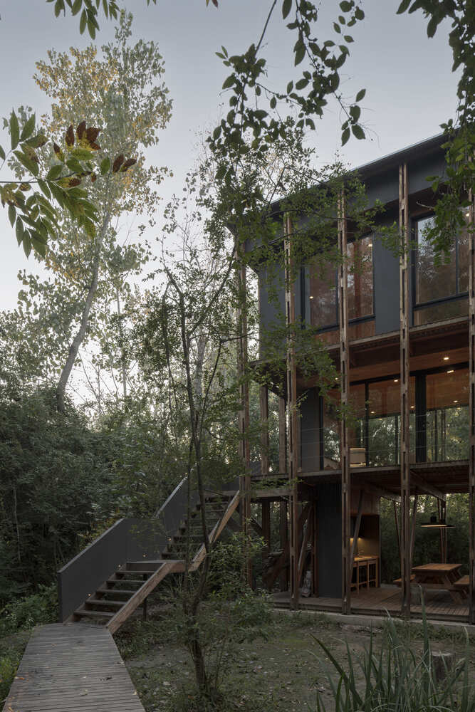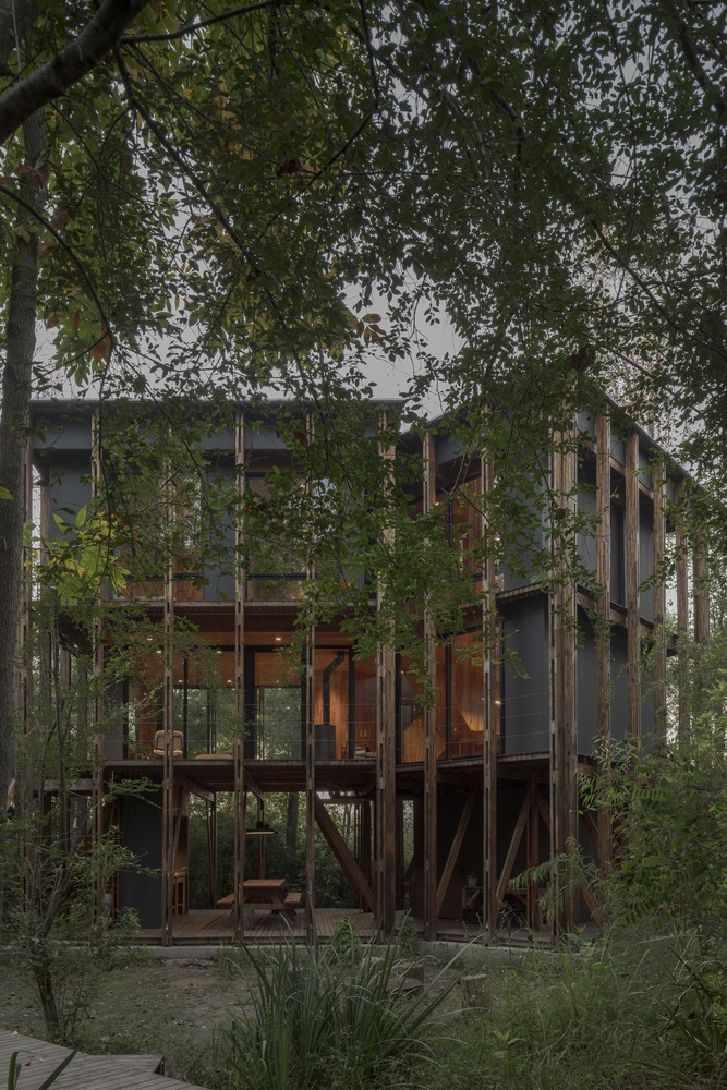 工业化加工的桩柱并非零散排列,而是构成一个 “有机整体”—— 每一根桩柱的位置、高度都经过精准计算,既承载着上部居住空间的重量,又形成视觉上的 “秩序感”,远看像一片由木材搭建的 “人工森林”,与周边的自然植被形成呼应与对比;设计摒弃了 “下方实体基座 + 上部箱体” 的传统模式,让结构从基座内部 “生长” 而出 —— 桩柱向上延伸,直接与上部的木构框架连接,没有生硬的 “衔接痕迹”,仿佛建筑是从土地中自然升起,既保持了轻盈感,又传递出 “扎根大地” 的稳固性,完美适配 “洪水可过、建筑无恙” 的需求。