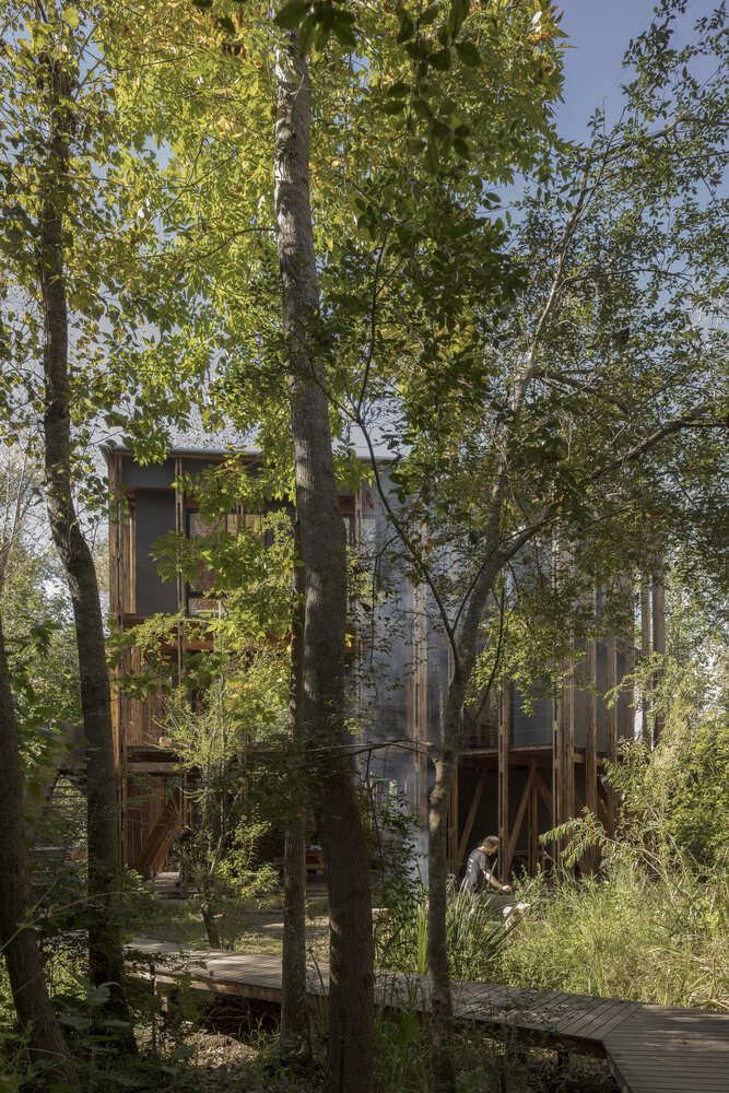 三角洲地区的 “桀骜” 是设计的核心挑战 —— 水路唯一的可达性、频发的洪水、原始且多变的自然环境,要求建筑既要 “对抗” 环境的不确定性,又要 “尊重” 土地的原生力量。马蒂亚斯・科森扎的解法,是回归古老的 “桩式体系”,却赋予其现代结构表达。桩式建筑并非新鲜事物,而是人类在湿地、河岸等复杂环境中沉淀的 “生存智慧”—— 将建筑架于桩柱之上,避开洪水侵袭,让水流可从建筑下方自由穿行。但在这座小屋中,桩式体系不再是 “被动的解决方案”,而是成为 “主动的结构表达”。
