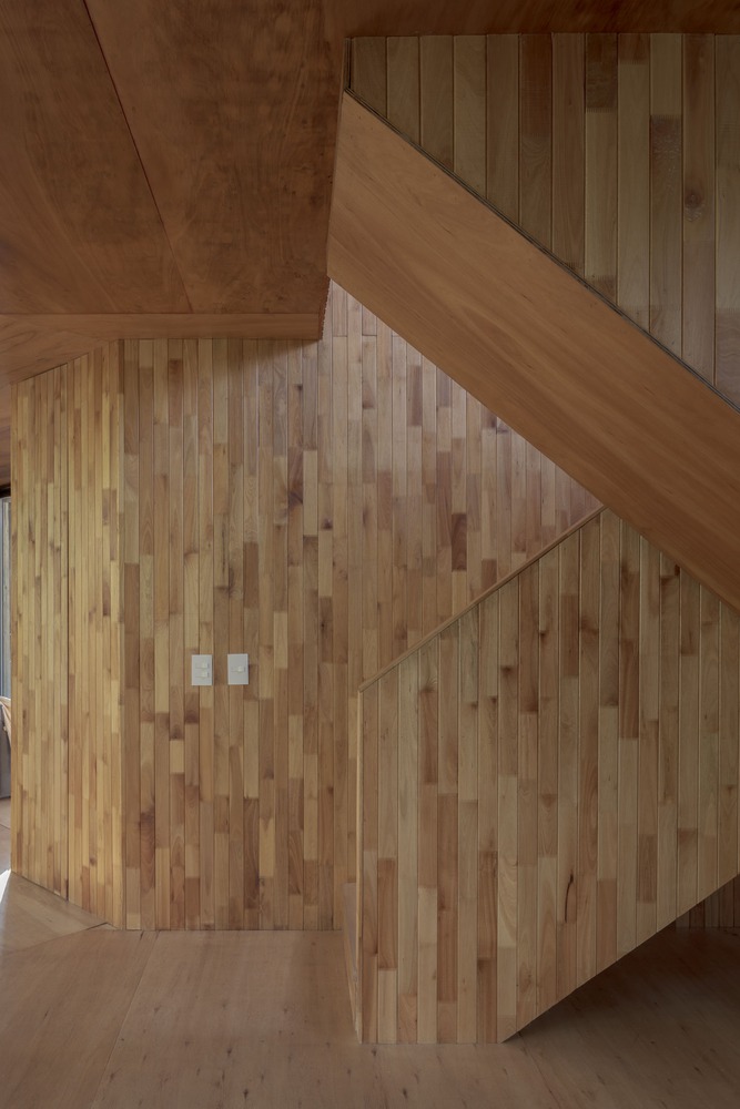 材料是建筑与环境对话的 “媒介”。这座小屋选用 “尾叶桉(Eucalipto rostrata)” 木材作为核心材料,既适配当地气候,又让建筑与土地建立 “物质层面的联系”。尾叶桉并非本地原生树种,却是 “已适应本地区环境的外来物种”—— 它耐旱、耐湿,且生长速度快,是经过实践验证的 “适应当地气候的可持续材料”。设计师对木材的使用,保持了 “克制与尊重”:木材没有经过过多装饰性处理,而是保留了天然的纹理与色泽 —— 天花、墙面、地板、家具均采用尾叶桉木材,仅做防腐、防潮处理,让木材的原生质感成为空间的 “主角”;木构框架的拼接处清晰可见,木材的收缩、纹理变化会随着时间推移逐渐显现,让建筑拥有 “随时间生长的生命力”—— 就像周边的树木会逐年粗壮,这座小屋也会在自然风化中沉淀出独特的 “岁月痕迹”,与三角洲的自然环境更紧密地融合。