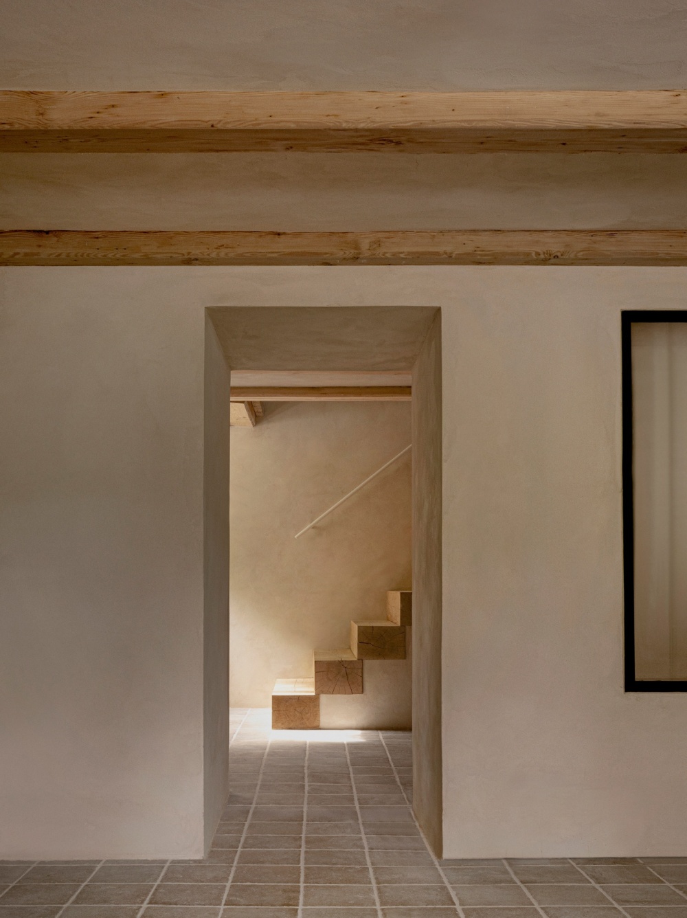 过渡空间的仪式感:走廊与楼梯间的设计是 “空间叙事的过渡带”。裸露的木梁与石灰墙形成质朴的背景,实木立柱上的艺术摆件如 “空间的标点符号”,让行走的过程成为一场 “材质与艺术的发现之旅”。光影从窗户斜射入走廊,在地面与墙面上切割出几何的韵律,为过渡空间注入了诗意的动感。