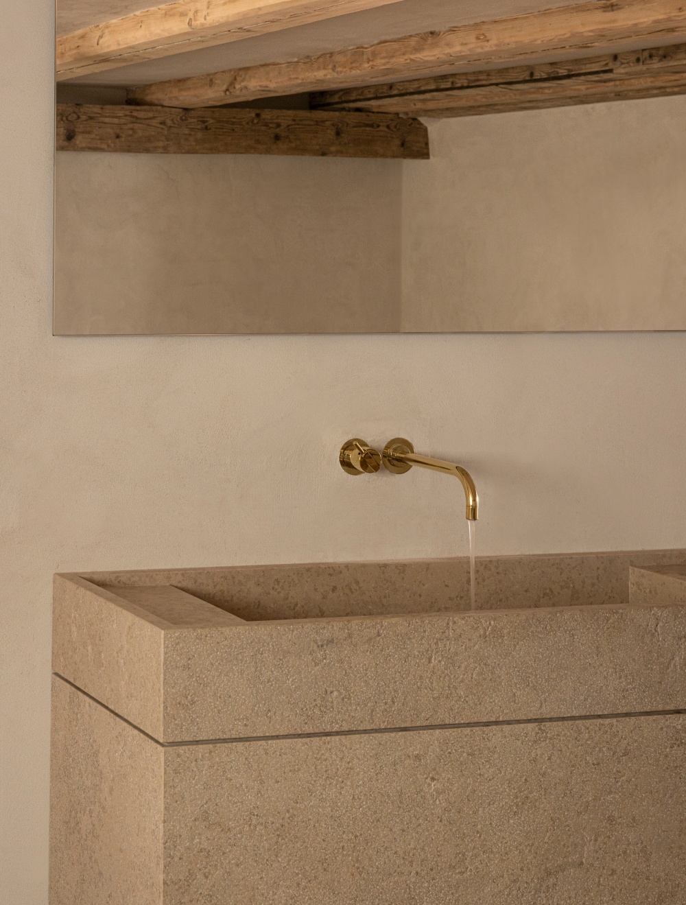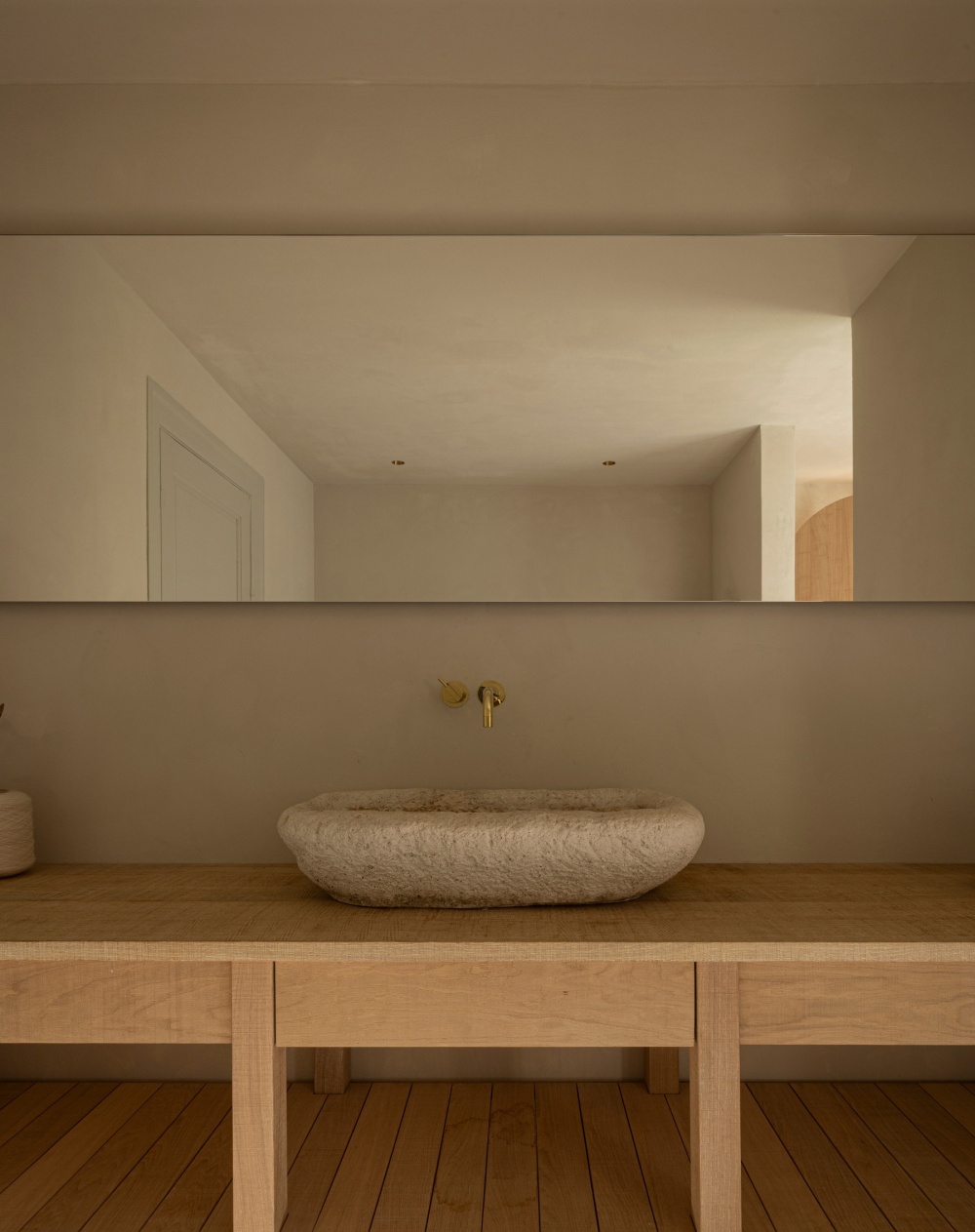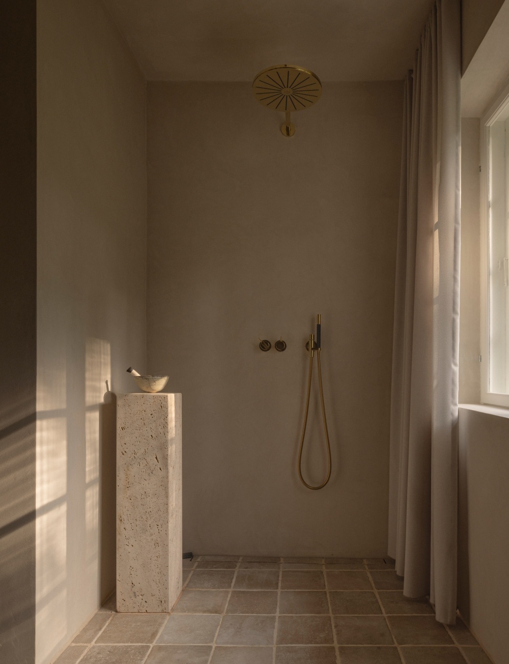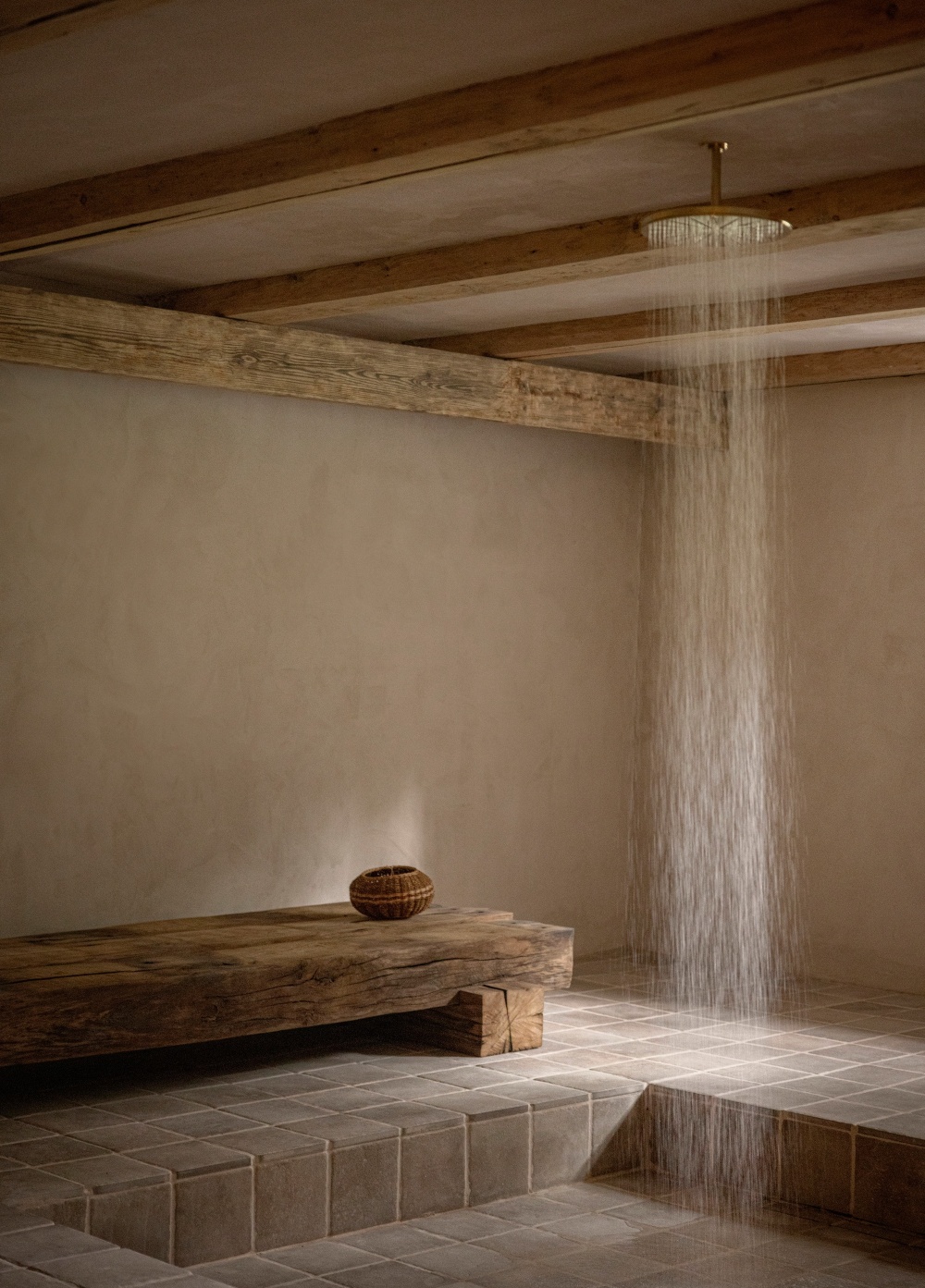 这种材质的本真表达,在浴室空间达到了极致:黄铜淋浴头的金属冷硬与石灰墙的温暖质朴碰撞,手工陶罐与实木立柱的组合则将 “卫浴功能” 升华为 “自然仪式”,让沐浴过程成为与材质、与自然对话的日常修行。