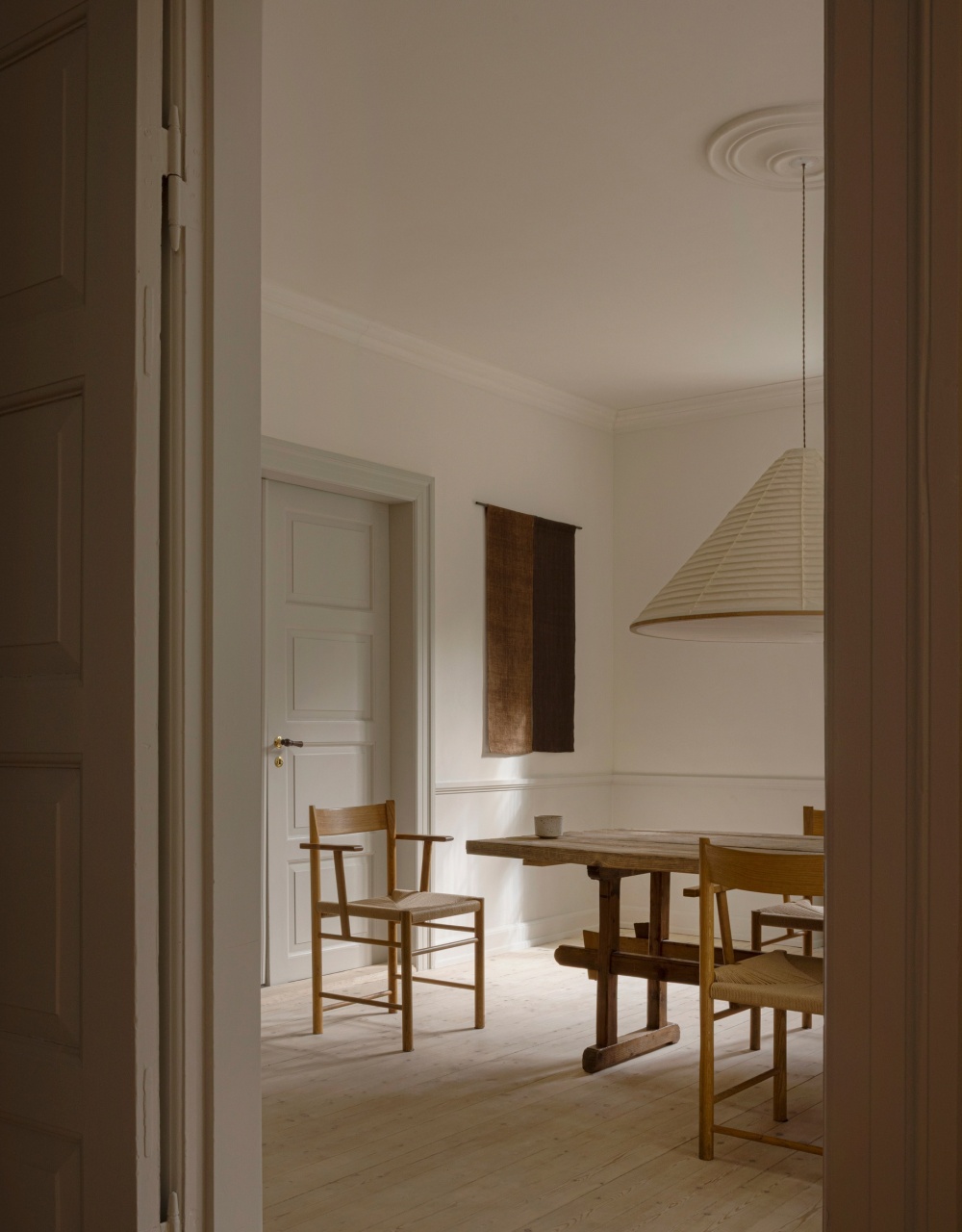 设计团队精准捕捉了 “自然主义生活” 的场景需求,打造出日常起居 — 艺术欣赏 — 自然仪式的全维度场景矩阵:日常起居场景:客厅的布艺沙发与实木茶几,构建出 “舒适友好型” 的会客空间。手工编织地毯的柔软触感与木梁的粗犷肌理形成 “软与硬” 的对比,让日常的休憩在质朴的氛围中充满温度。餐厅的实木长桌与藤编餐椅,延续了材质的统一逻辑,一盏纸艺吊灯的暖光则为用餐场景注入了家的温馨。