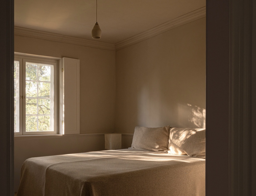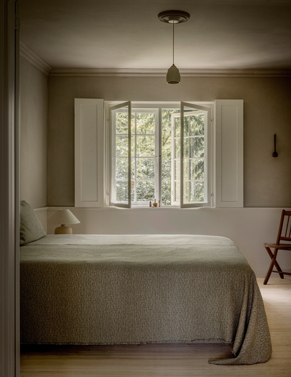 私密区域的静谧与光影:卧室空间以 “小尺度 + 大窗户” 的设计打破压抑感。白色百叶窗过滤后的自然光,在墙面与床品上形成斑驳的光影,如同一幅 “动态的光影画”,让卧室在白天充满自然的明亮,夜晚则因一盏小吊灯的暖光而变得静谧安详。窗户的尺度精准控制在 “框景自然” 的最佳比例,将室外的绿树繁花引入室内,模糊了 “内与外” 的边界。