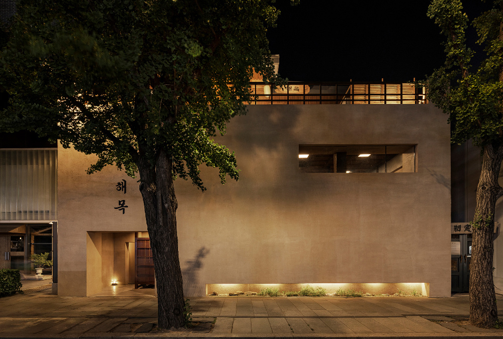 夜幕下,「해묵」的外立面如同一幅留白的日式卷轴。浅棕色的夯土墙面,带着手工涂抹的粗糙肌理,没有过多修饰,却在岁月感中透出沉静的力量。墙体上 “해묵” 的黑色书法字体,笔锋苍劲,与质朴墙面形成 “文与质” 的呼应,暗示着空间内 “食物与意境” 的平衡。入口处做了内凹式处理,暖黄的地灯从地面与墙面缝隙透出微光,像是在夜色里轻轻 “叩门”,引导食客步入空间。这种 “隐而不彰” 的设计,既与周边喧嚣的街景形成区隔,也为用餐体验铺垫了 “从尘世步入宁静” 的心理过渡。
