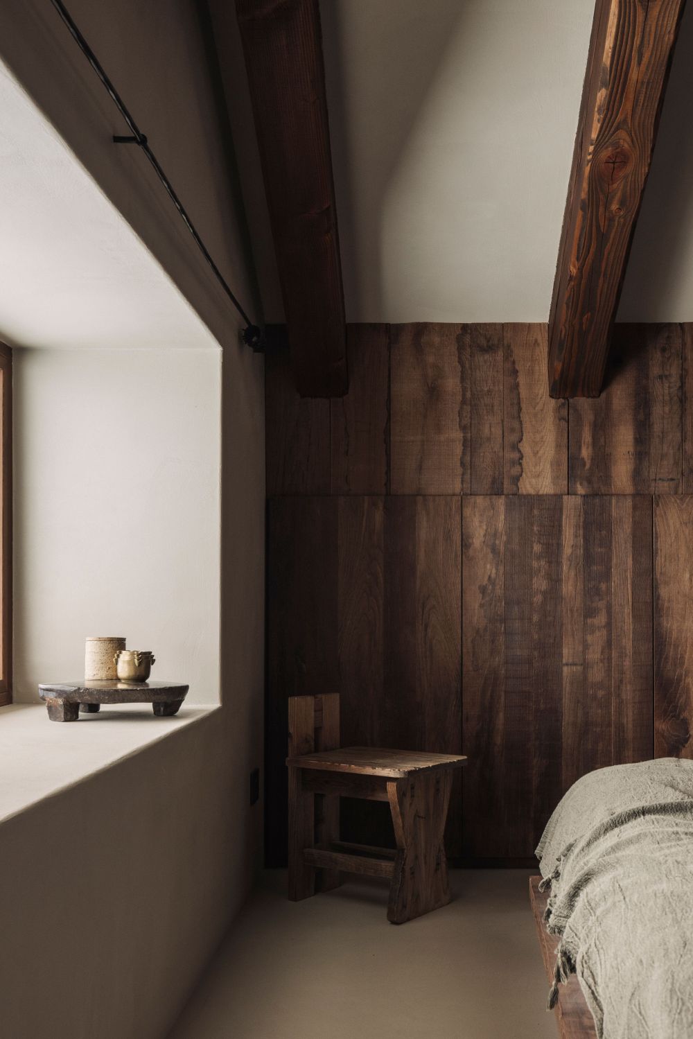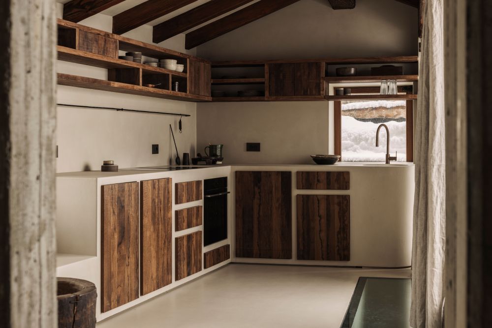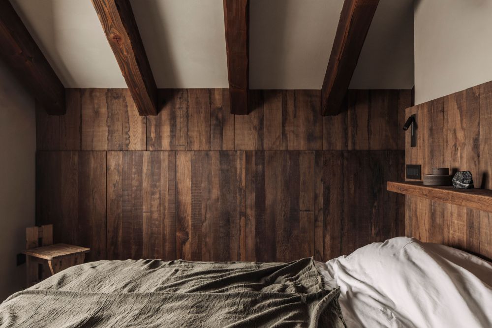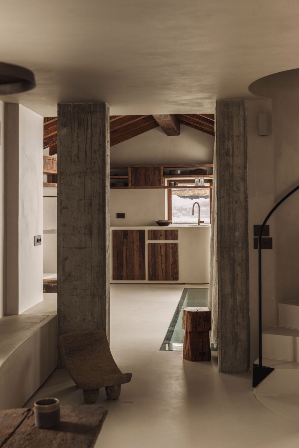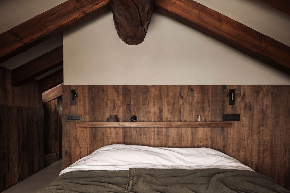 建材的选择是蒙塔尼亚之家与地域对话的核心。设计团队与当地工匠深度合作,选用源自阿尔卑斯山区的阿勒颇松(alerce)木材,根据墙板、厨房、浴室、家具等不同用途精准挑选木板,所有木材均取自本地山区,就连建造壁炉的材料都需通过直升机运输,尽显对地域文化的尊重。同时,Maison Osaïn 延续其标志性的 “真实性” 追求,将上釉混凝土与木材相结合 —— 这两种材质既是比利时极简主义的象征,又与库马约尔小镇的历史渊源相呼应。木材的温润肌理中和了混凝土的冷硬,两种材质在空间中相互映衬,无需多余装饰,便以本身的质感诉说着山间生活的纯粹。