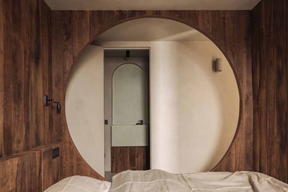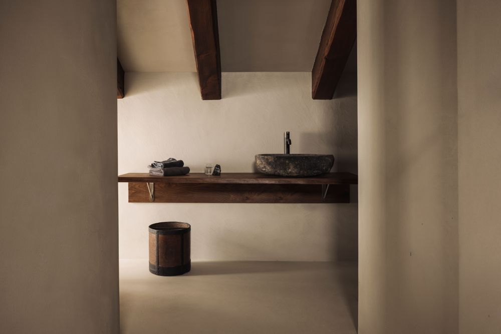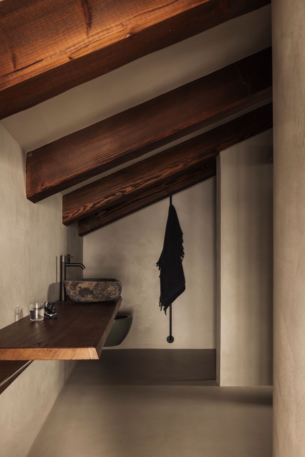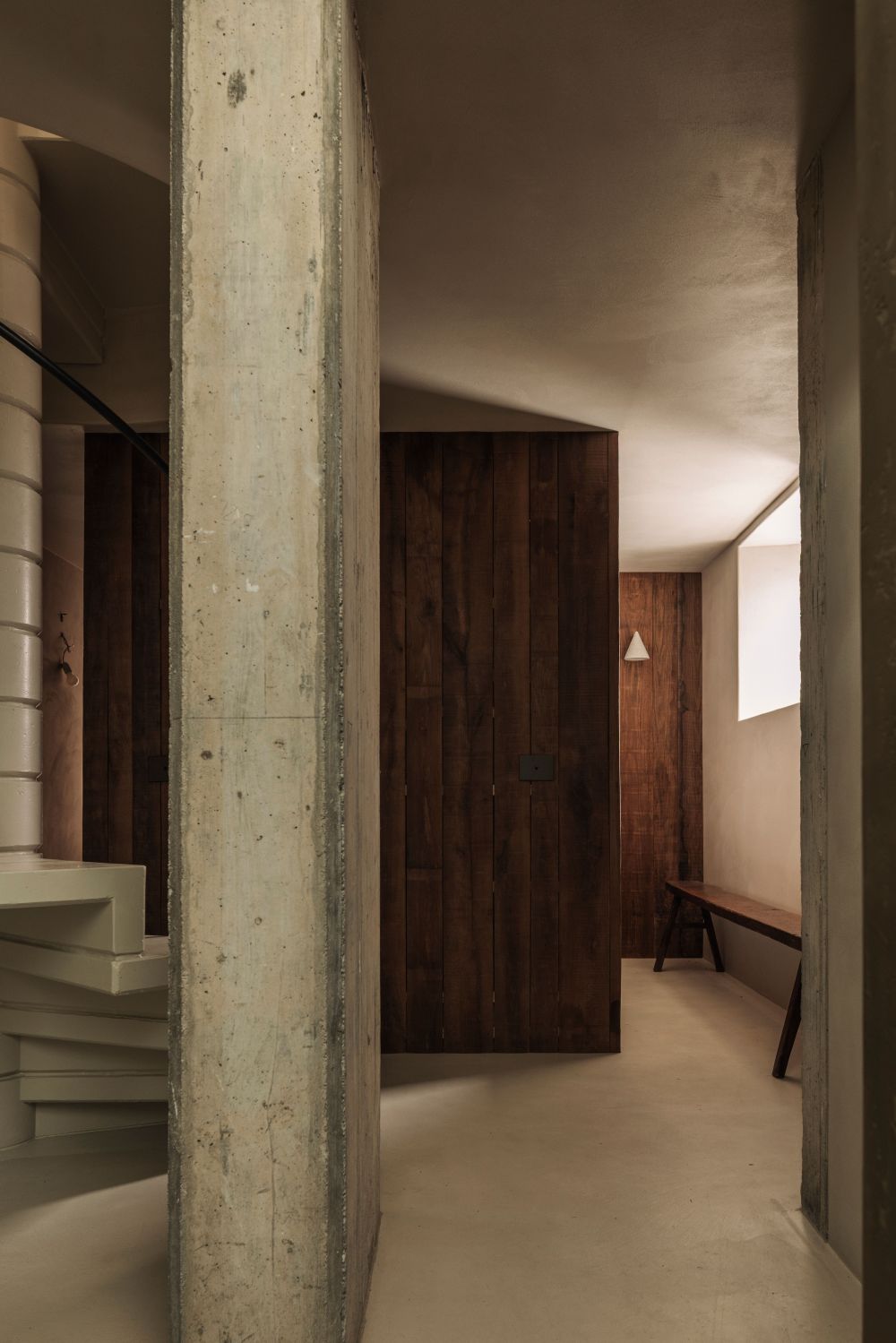 建材的选择是蒙塔尼亚之家与地域对话的核心。设计团队与当地工匠深度合作,选用源自阿尔卑斯山区的阿勒颇松(alerce)木材,根据墙板、厨房、浴室、家具等不同用途精准挑选木板,所有木材均取自本地山区,就连建造壁炉的材料都需通过直升机运输,尽显对地域文化的尊重。同时,Maison Osaïn 延续其标志性的 “真实性” 追求,将上釉混凝土与木材相结合 —— 这两种材质既是比利时极简主义的象征,又与库马约尔小镇的历史渊源相呼应。木材的温润肌理中和了混凝土的冷硬,两种材质在空间中相互映衬,无需多余装饰,便以本身的质感诉说着山间生活的纯粹。