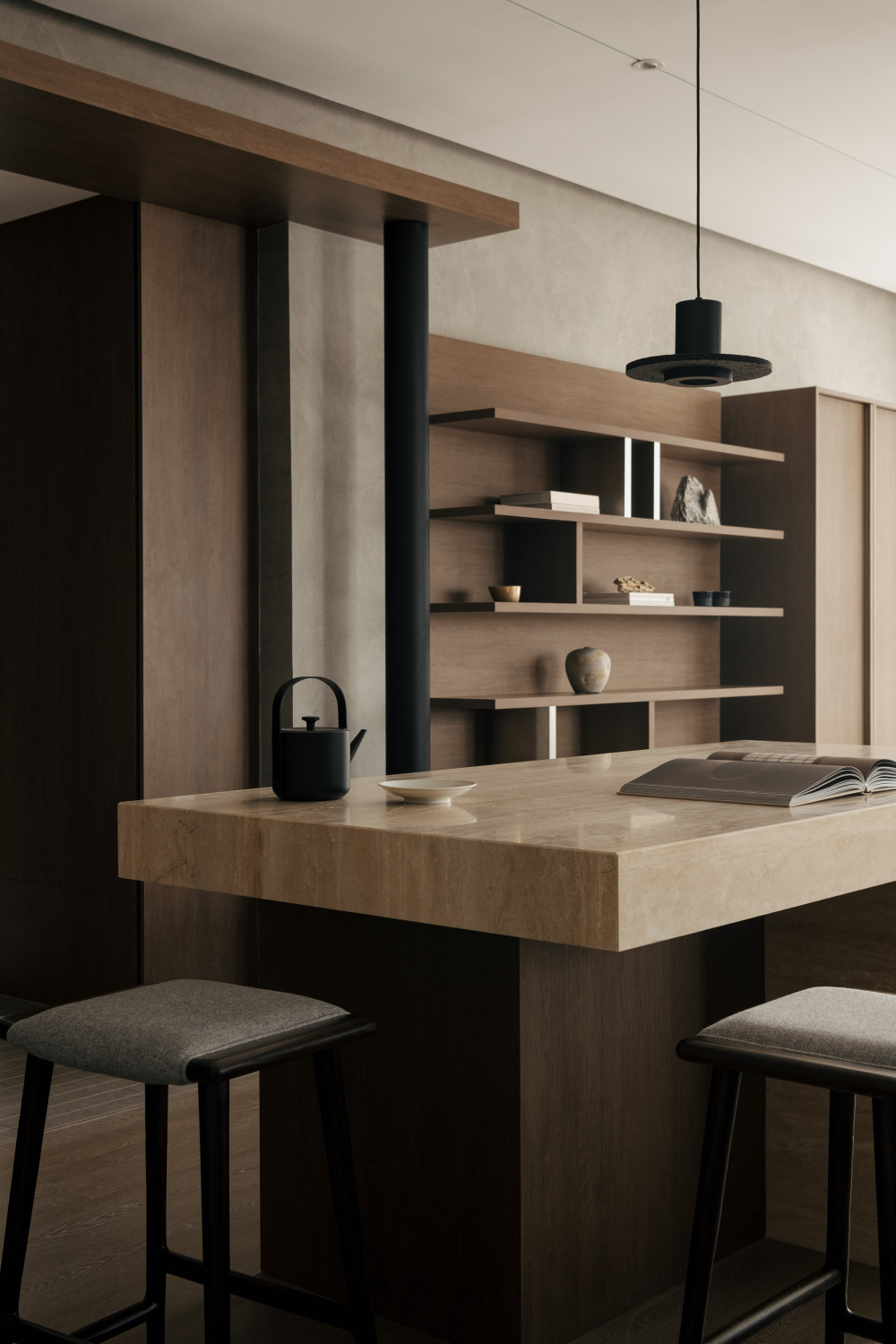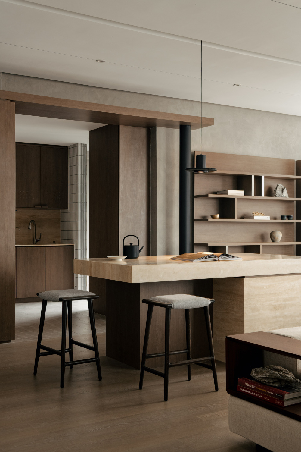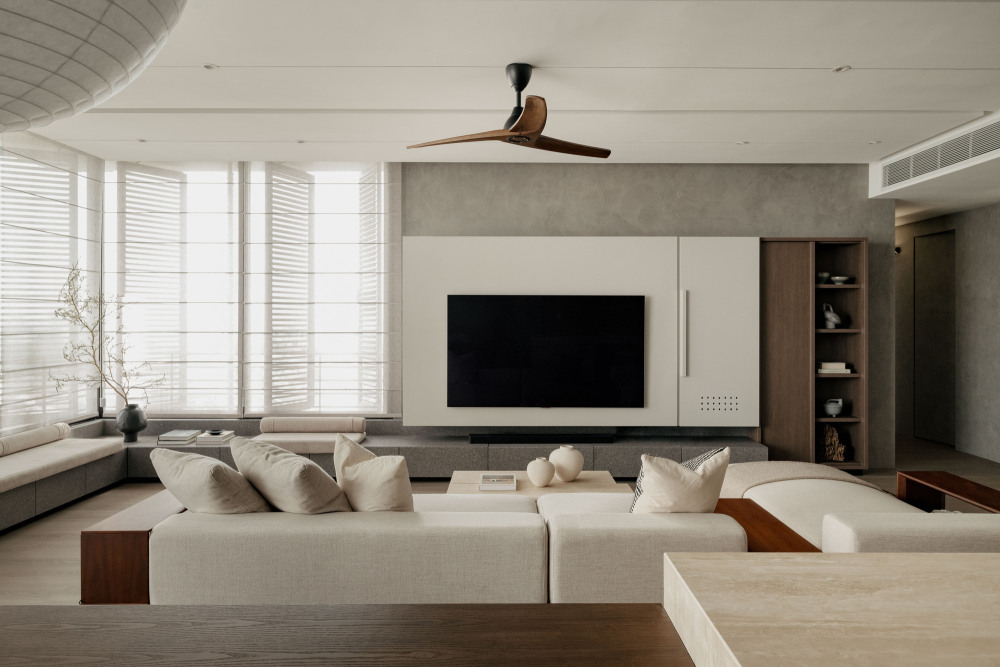Wuuu 工作室始终坚持 “每一个设计元素都应呈现二元平衡”,在 SS2 公寓中,“开阔的空间” 与 “克制的材质” 形成了巧妙的平衡 —— 没有过多的色彩与材质堆砌,只用少数几种材料,就营造出沉静而有温度的氛围:自然材质的本真:餐具柜台面与咖啡桌选用洞石(travertine),带着自然的孔洞与纹理,像从大地中取出的原石,触摸时能感受到自然的厚重;定制家具采用橡木,浅色系的木材带着温润的肌理,从餐桌、沙发框架到卧室的榻榻米地面,统一的木质色调让空间更和谐;背景墙面则用质感细腻的水泥涂层,柔和的灰色调不抢镜,却为其他材质提供了 “安静的背景”。
