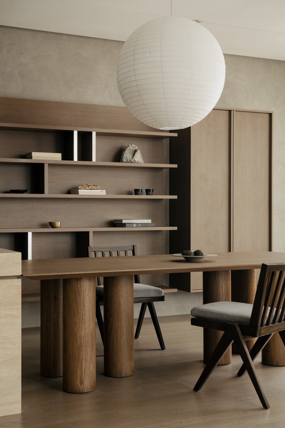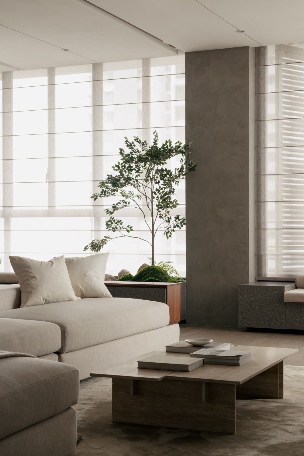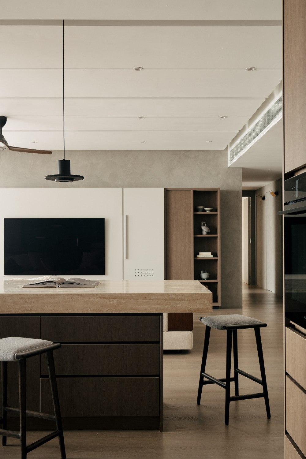 Wuuu 工作室始终坚持 “每一个设计元素都应呈现二元平衡”,在 SS2 公寓中,“开阔的空间” 与 “克制的材质” 形成了巧妙的平衡 —— 没有过多的色彩与材质堆砌,只用少数几种材料,就营造出沉静而有温度的氛围:自然材质的本真:餐具柜台面与咖啡桌选用洞石(travertine),带着自然的孔洞与纹理,像从大地中取出的原石,触摸时能感受到自然的厚重;定制家具采用橡木,浅色系的木材带着温润的肌理,从餐桌、沙发框架到卧室的榻榻米地面,统一的木质色调让空间更和谐;背景墙面则用质感细腻的水泥涂层,柔和的灰色调不抢镜,却为其他材质提供了 “安静的背景”。