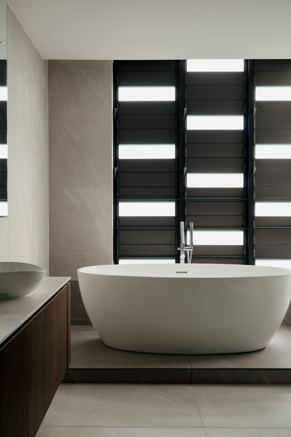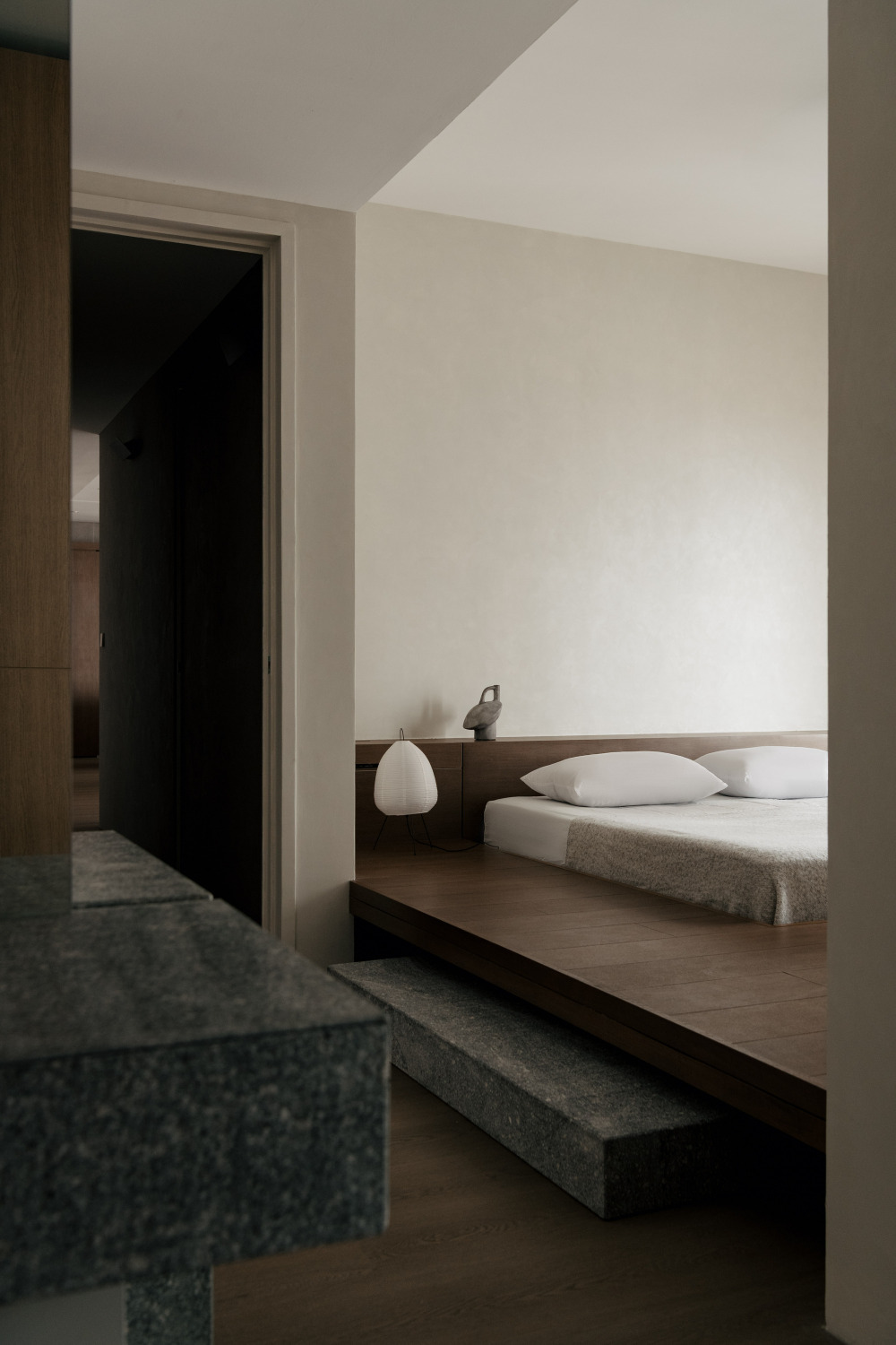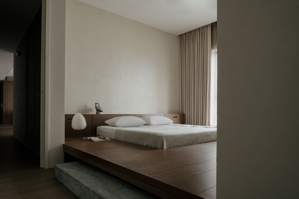 卧室的设计,延续了整体的现代日式理念,却更注重 “松弛感” 与 “仪式感”。Wuuu 工作室借鉴巴厘岛 Further 酒店的设计,在抬高的榻榻米地面上打造了一张 “下沉式床”:榻榻米地面比床面高出几厘米,床边设置花岗岩台阶,居住者需要 “踏上台阶、步入床区”—— 这小小的 “步入动作”,像一场 “休憩的仪式”,提醒自己 “放下白天的忙碌,进入放松状态”。通往衣柜与浴室的动线被设计得 “迂回”,没有直接的开门见山,而是通过同款石材砌块界定过渡空间 —— 既保证了卧室的私密性,又让动线多了份 “探索的趣味”。细节上,梳妆台被设计成 “悬浮独立” 的视觉效果:利用阴影线条与缝隙,搭配一面通高镜子,让梳妆台仿佛 “飘” 在墙面,没有厚重的柜体感,既节省空间,又让卧室更显轻盈。