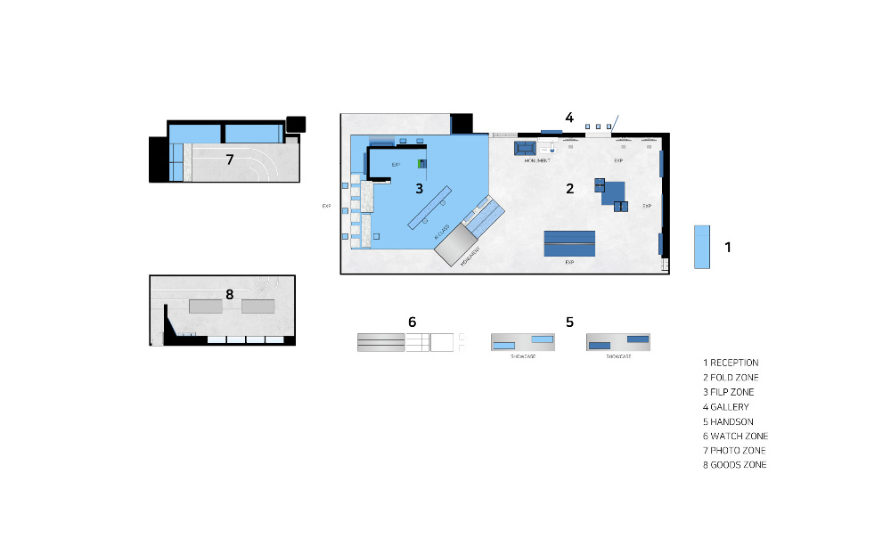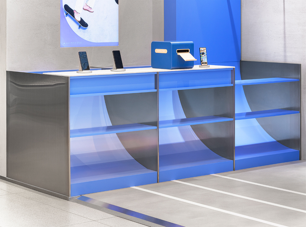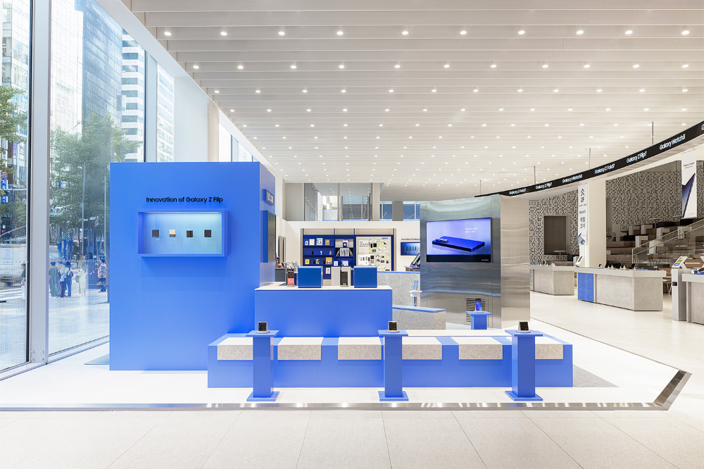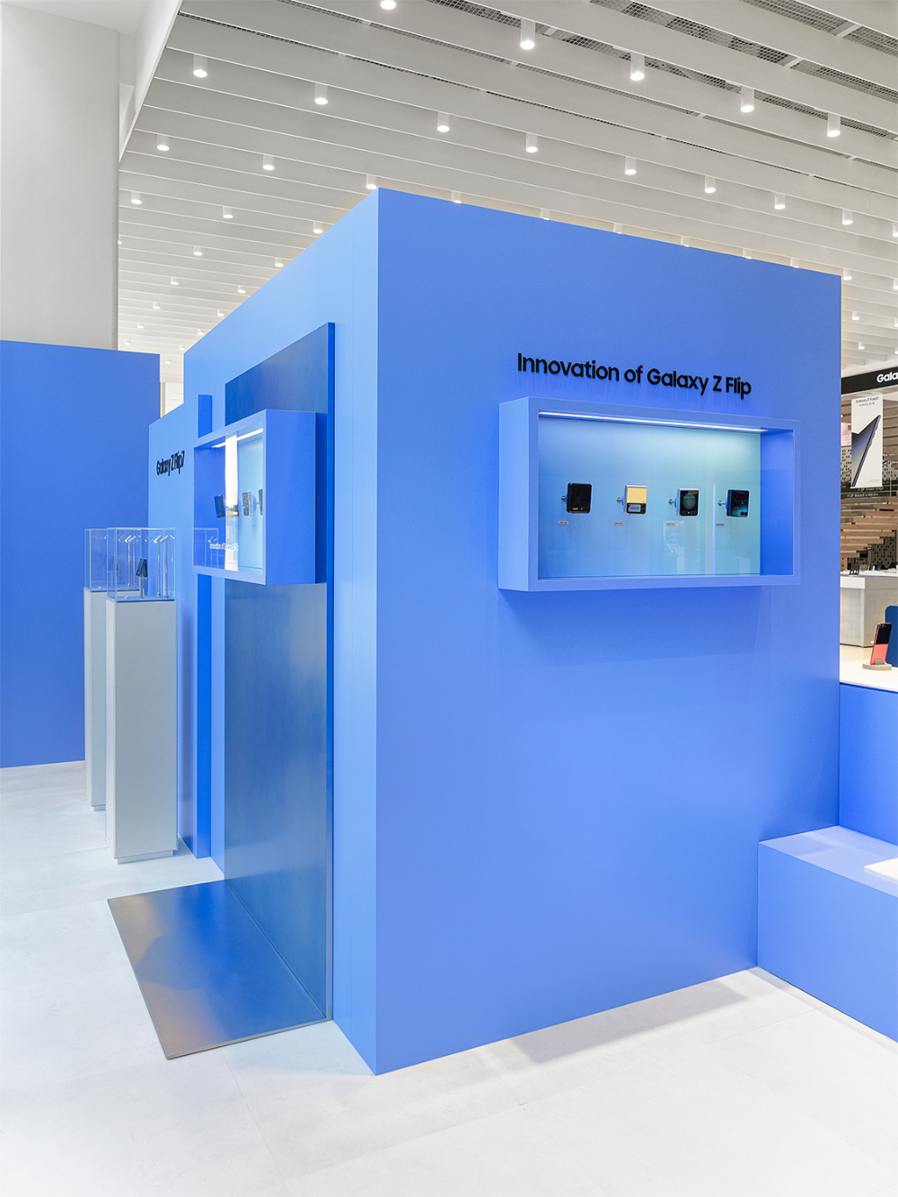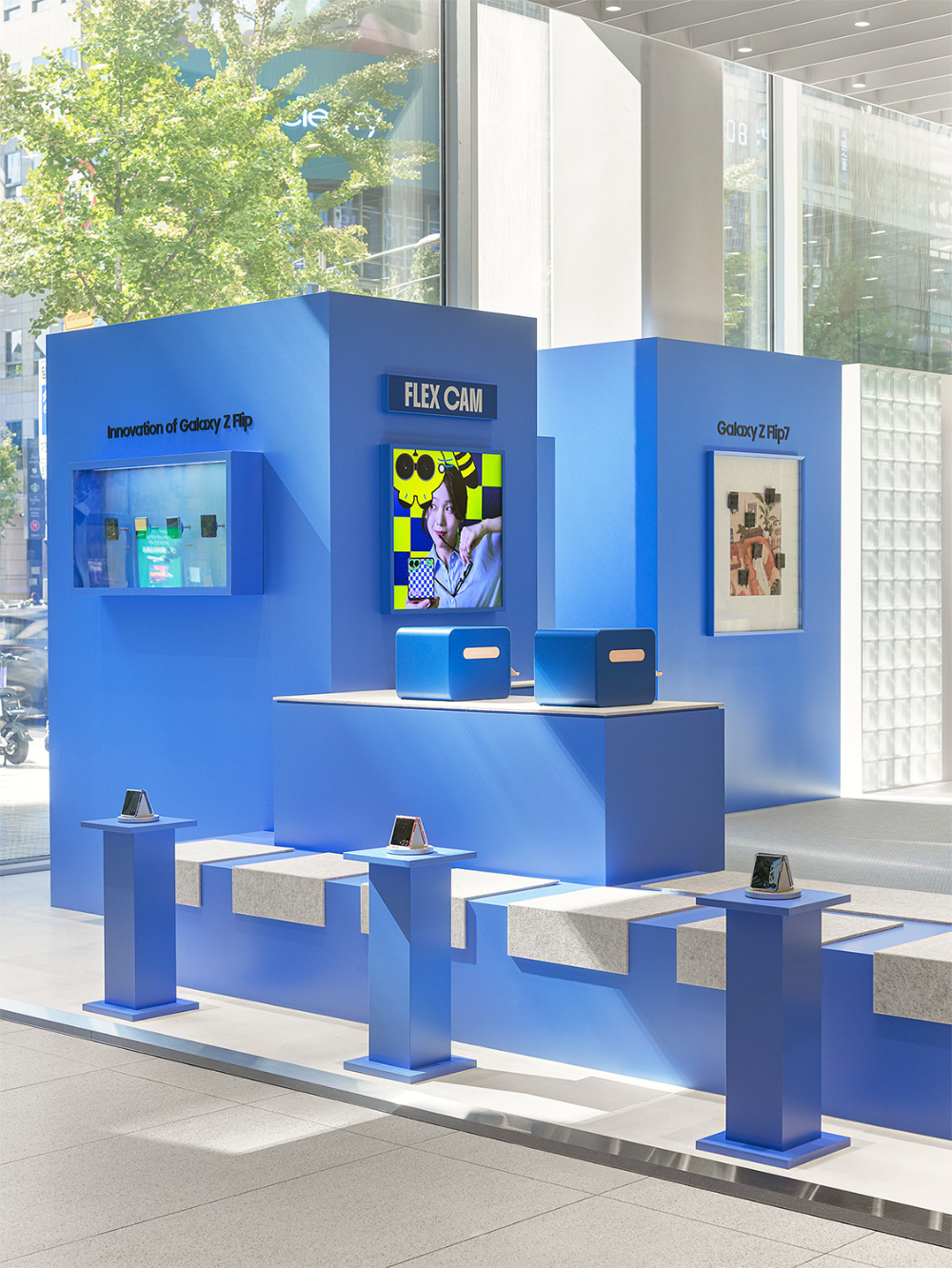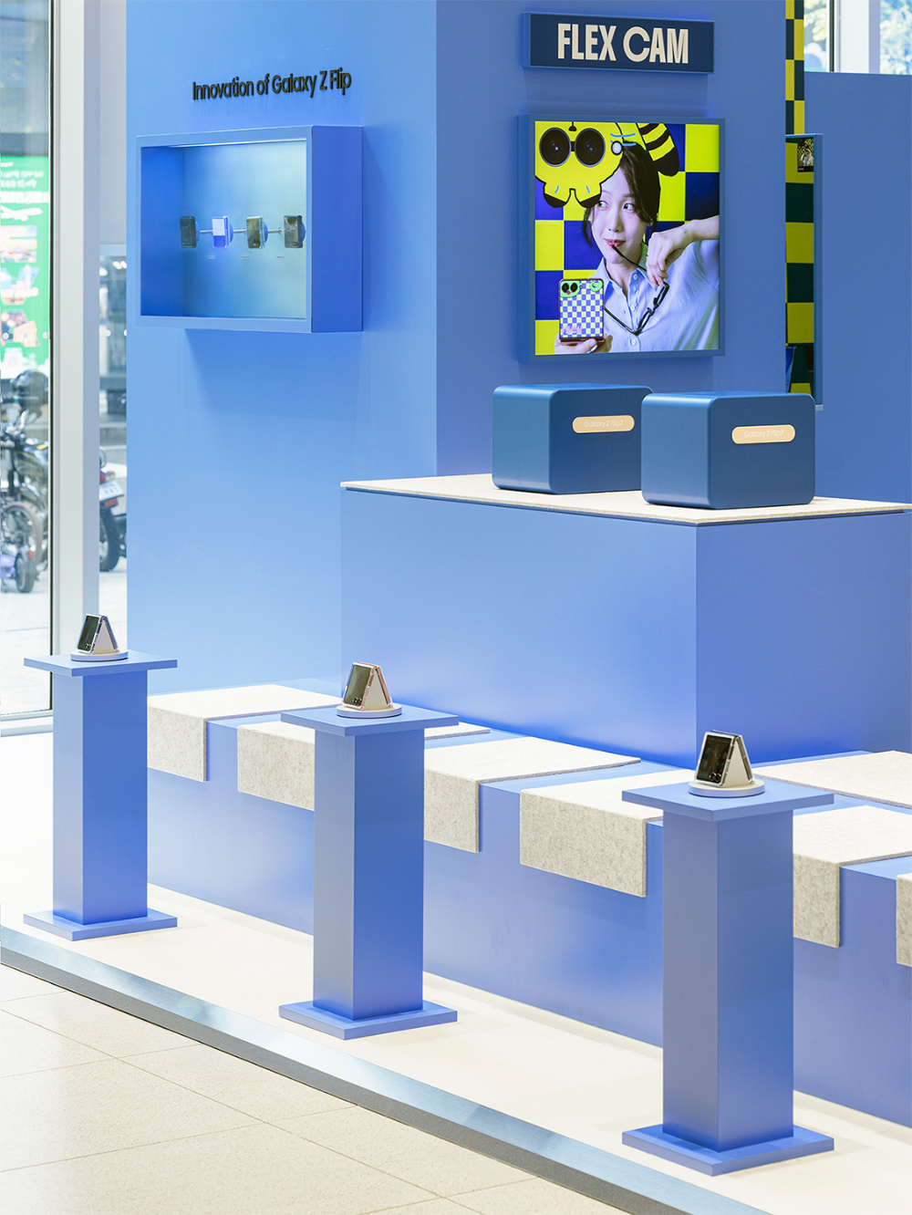 如果说科技蓝是空间的“视觉外衣”,那么模块化体验单元则是空间的“功能内核”。设计团队将折叠屏“柔性、创新、形态可变”的核心特性,转化为一个个可互动的空间模块,让产品的技术卖点从抽象参数变为具象的体验场景,彻底打破了“看参数—听讲解”的传统零售模式。体验单元的设计实现了“产品功能与空间场景的精准对应”:“Innovation of Galaxy Z Flip”单元以阶梯式展示柜呈现产品迭代历程,从初代到Z Flip7的机型依次排列,配合墙面的技术节点说明,将“折叠屏的进化史”转化为可视化的空间叙事,让访客直观感受技术的突破;“FLEX CAM”互动区则聚焦折叠屏的核心拍摄功能,设置了网红打卡装置与场景化背景板,访客可直接使用Z Flip7的多角度拍摄功能完成创作并即时分享,让“产品功能”直接转化为“社交体验”,极大提升了体验的参与感与传播性。