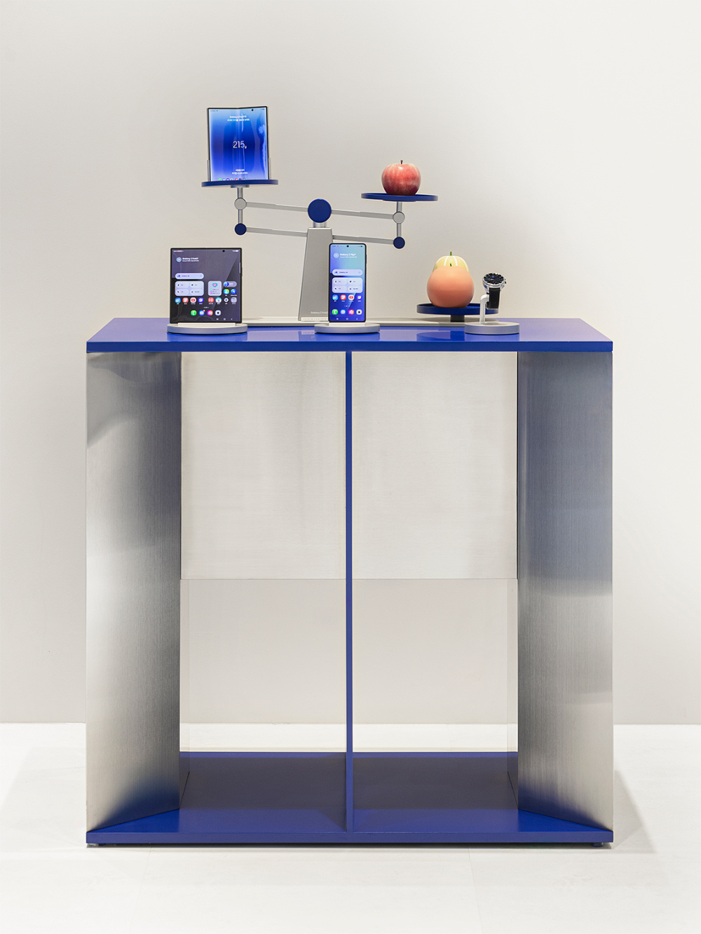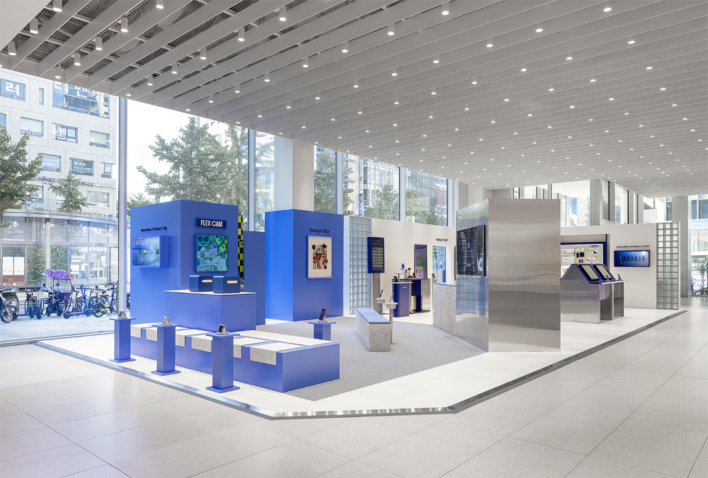 设计的首要任务,是让品牌基因成为空间的“隐形向导”。三星标志性的“科技蓝”被确立为视觉核心,通过“色彩层级构建+材质质感调和”的策略,实现了品牌符号从平面到立体的场景化落地,既强化了识别性,又规避了高饱和度色彩的压迫感。色彩的功能性分区成为动线设计的核心线索:Z Flip7体验区采用大面积高饱和度蓝色模块,与产品视觉系统直接关联,形成强烈的视觉记忆点,瞬间抓住访客注意力;而常规产品展示区则以浅灰与白色为基底,通过色彩饱和度的差异,自然引导访客形成“重点体验折叠屏新品—辅助了解其他品类”的行动路径,实现了“视觉吸引与功能引导”的双重目标。